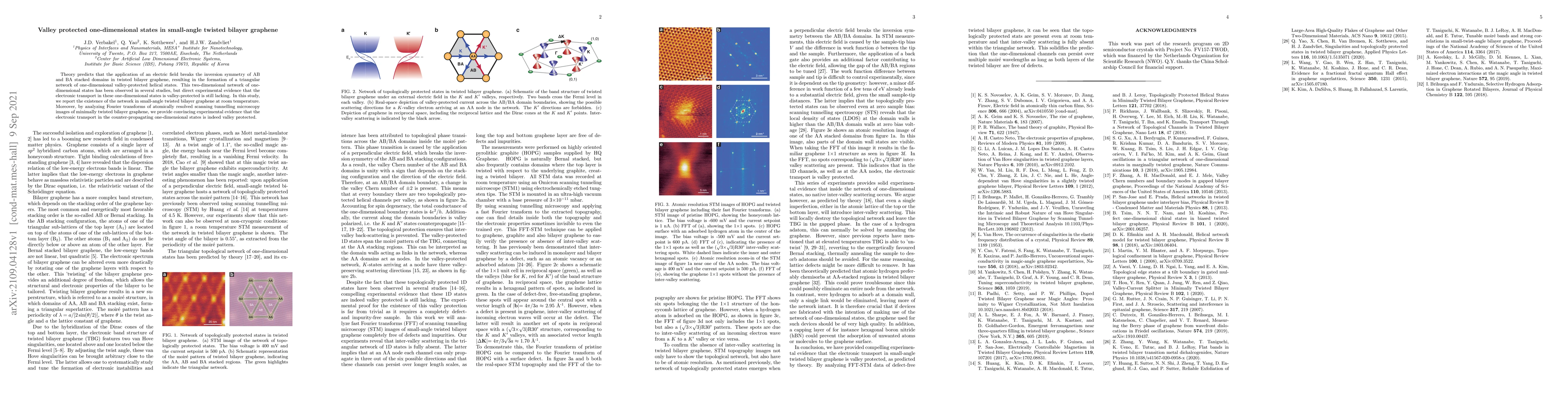 This study confirms the theoretical prediction of valley-protected one-dimensional helical states in small-angle twisted bilayer graphene, using atomically resolved scanning tunneling microscopy to provide direct experimental evidence for the valley-protected nature of electronic transport in these states at room temperature.