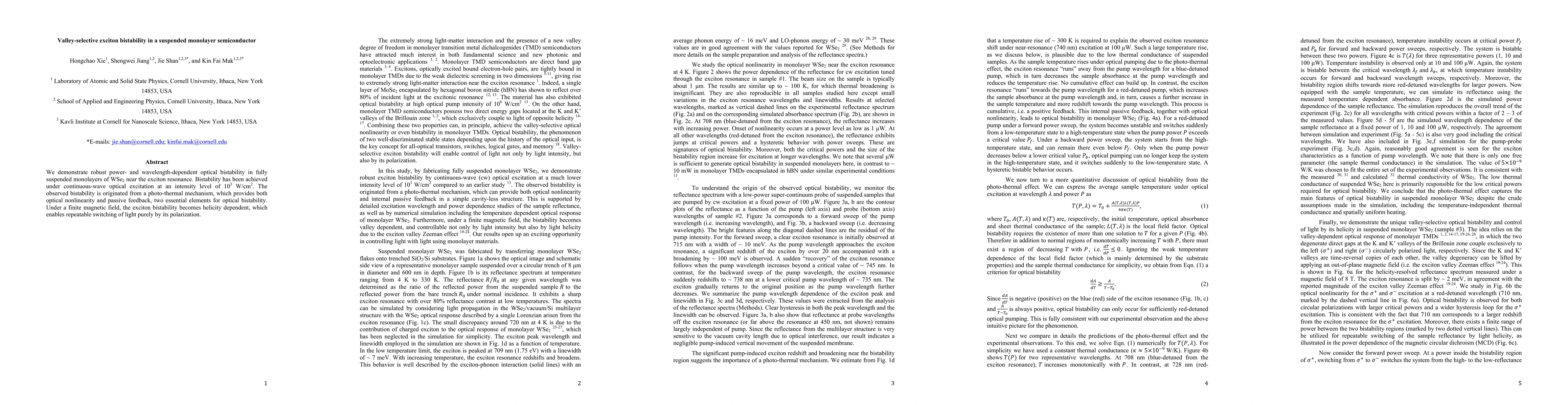 We demonstrate robust power- and wavelength-dependent optical bistability in fully suspended monolayers of WSe2 near the exciton resonance. Bistability has been achieved under continuous-wave optical excitation at an intensity level of 10^3 W/cm^2. The observed bistability is originated from a photo-thermal mechanism, which provides both optical nonlinearity and passive feedback, two essential elements for optical bistability. Under a finite magnetic field, the exciton bistability becomes helicity dependent, which enables repeatable switching of light purely by its polarization.