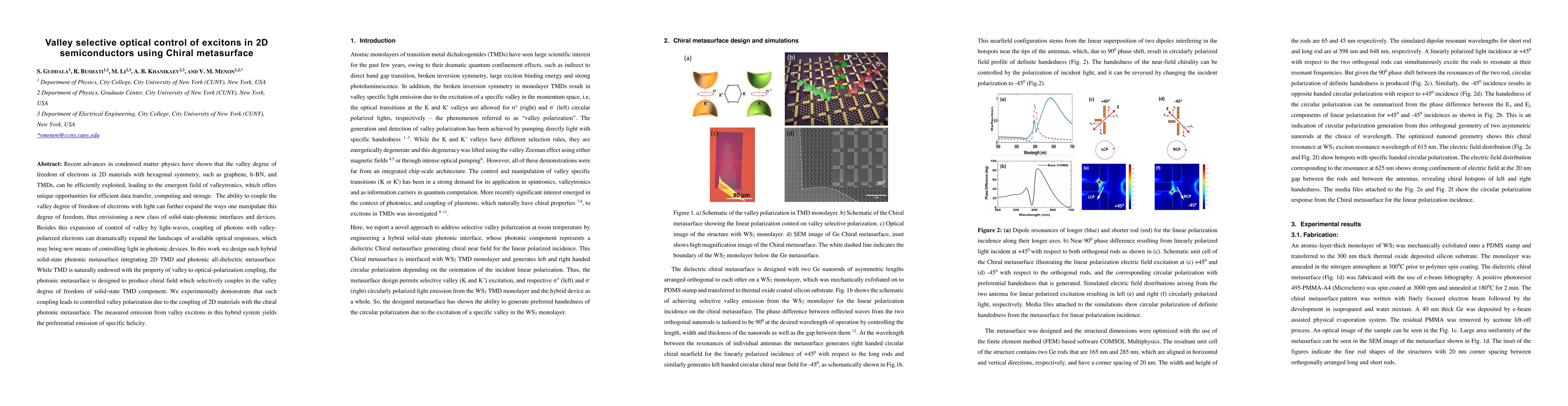 The design and fabrication of a chiral metasurface capable of selectively addressing specific valleys in 2D TMDs, demonstrating enhanced degree of circular polarization despite the localized nature of resonances.