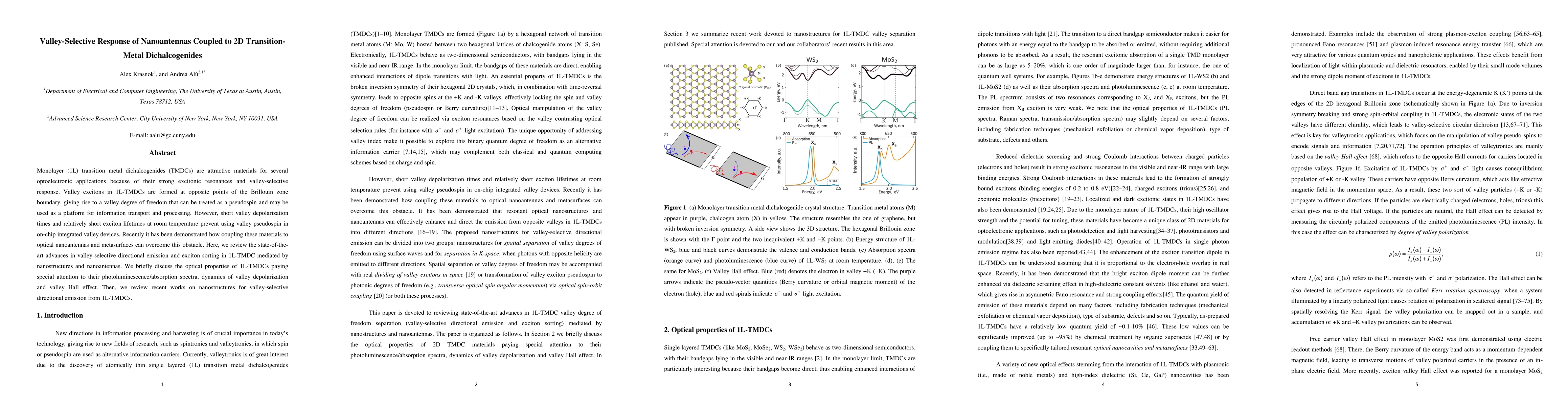This paper reviews advances in valley-selective directional emission and exciton sorting in monolayer transition metal dichalcogenides (TMDCs) using nanoantennas. It highlights the optical properties of 1L-TMDCs and discusses recent developments in nanostructures for enhancing valley-selective emission.