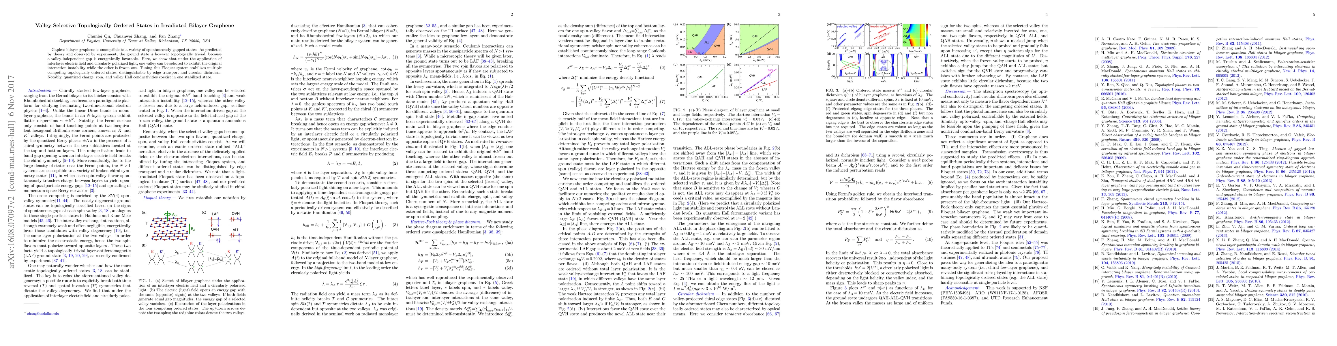 This paper demonstrates how applying an interlayer electric field and circularly polarized light to bilayer graphene can selectively induce topological ordered states in one valley, while freezing the other valley. This tuning stabilizes multiple topological states, characterized by unique edge transport and circular dichroism, including a state with quantized charge, spin, and valley Hall conductivities.