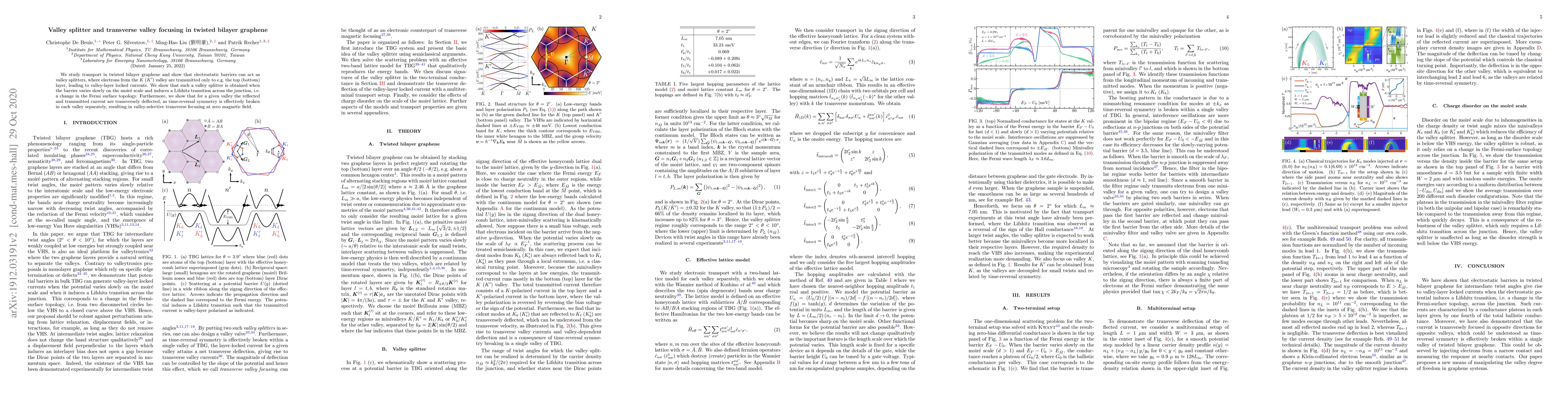 The study reveals that electrostatic barriers in twisted bilayer graphene act as valley splitters, directing electrons from one valley to specific layers and causing valley-layer locked currents. Additionally, the barriers induce transverse valley focusing by deflecting reflected and transmitted currents due to broken time-reversal symmetry.