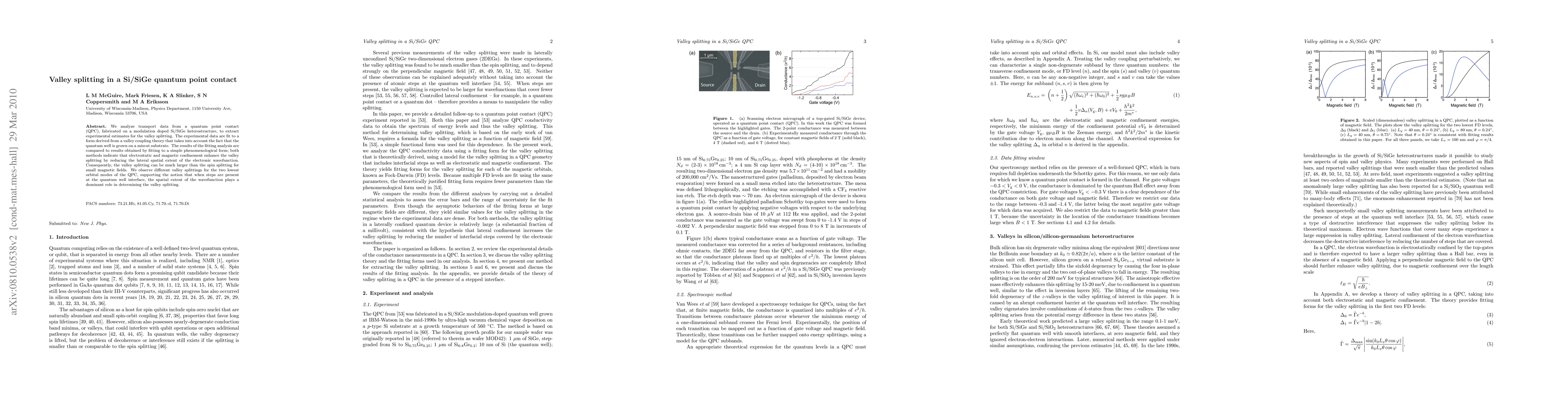 This research investigates valley splitting in a Si/SiGe quantum point contact (QPC) using both theoretical modeling and experimental measurements on a Schottky-gated device. The study finds that both QPC and magnetic fields enhance valley splitting by confining the electronic wavefunction, often leading to larger valley splitting than spin splitting under small magnetic fields.