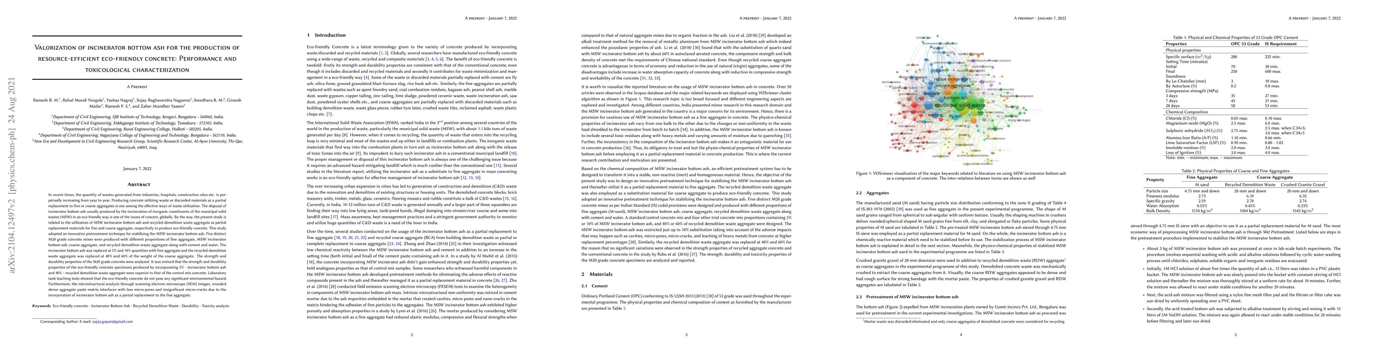 This study explores the use of incinerator bottom ash and recycled demolition waste aggregate in eco-friendly concrete production, finding that optimal mixes show superior strength and durability. Laboratory tests confirm these concrete mixtures pose no significant environmental hazards.