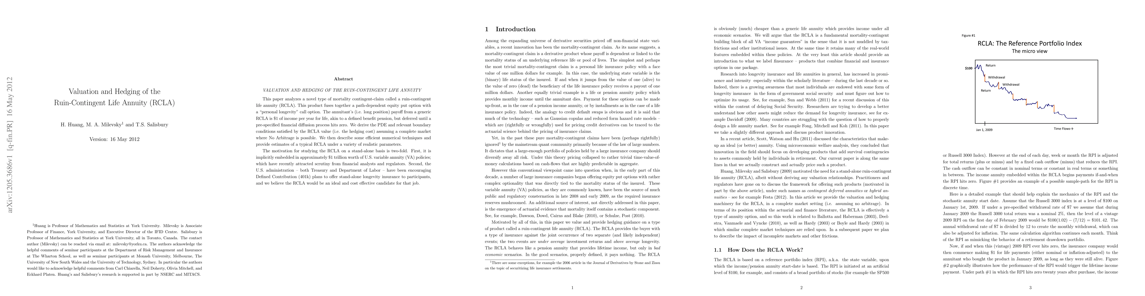 This paper analyzes a novel type of mortality contingent-claim called a ruin-contingent life annuity (RCLA). This product fuses together a path-dependent equity put option with a "personal longevity" call option. The annuitant's (i.e. long position) payoff from a generic RCLA is \$1 of income per year for life, akin to a defined benefit pension, but deferred until a pre-specified financial diffusion process hits zero. We derive the PDE and relevant boundary conditions satisfied by the RCLA value (i.e. the hedging cost) assuming a complete market where No Arbitrage is possible. We then describe some efficient numerical techniques and provide estimates of a typical RCLA under a variety of realistic parameters. The motivation for studying the RCLA on a stand-alone basis is two-fold. First, it is implicitly embedded in approximately \$1 trillion worth of U.S. variable annuity (VA) policies; which have recently attracted scrutiny from financial analysts and regulators. Second, the U.S. administration - both Treasury and Department of Labor - have been encouraging Defined Contribution (401k) plans to offer stand-alone longevity insurance to participants, and we believe the RCLA would be an ideal and cost effective candidate for that job.