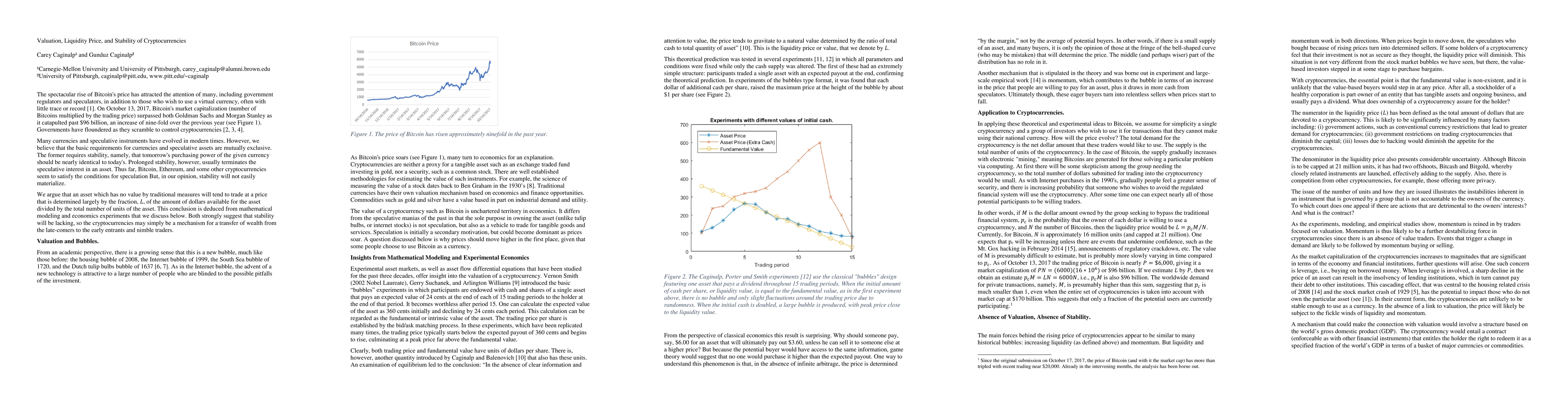 Cryptocurrencies are examined through the asset flow equations and experimental asset markets. Since tangible value of a typical cryptocurrency is non-existent, the theory suggests that price will gravitate toward liquidity value, i.e., the total amount of cash available for purchase of the asset divided by the number of units. Thus it is unlikely that cryptocurrencies in their current form will be stable in the absence of a mechanism of a link to value.