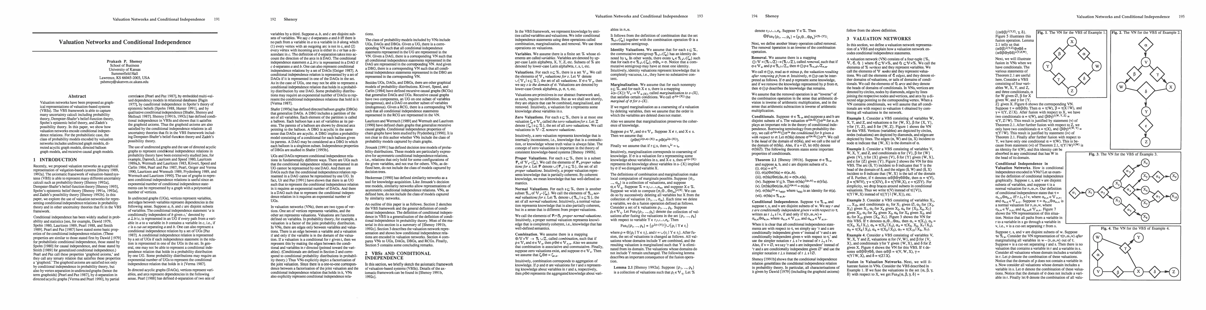 Valuation networks have been proposed as graphical representations of valuation-based systems (VBSs). The VBS framework is able to capture many uncertainty calculi including probability theory, Dempster-Shafer's belief-function theory, Spohn's epistemic belief theory, and Zadeh's possibility theory. In this paper, we show how valuation networks encode conditional independence relations. For the probabilistic case, the class of probability models encoded by valuation networks includes undirected graph models, directed acyclic graph models, directed balloon graph models, and recursive causal graph models.