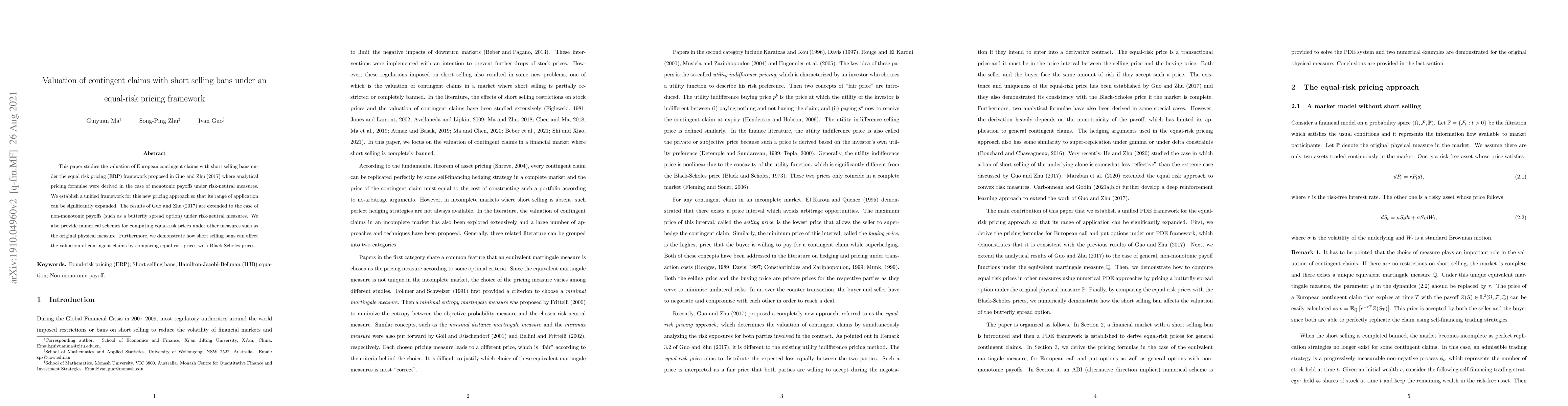 This paper extends the equal-risk pricing framework for valuing European contingent claims, including non-monotonic payoffs like butterfly spread options, and introduces numerical schemes for computing prices under different measures. It also examines the impact of short selling bans on valuation compared to Black-Scholes pricing.
