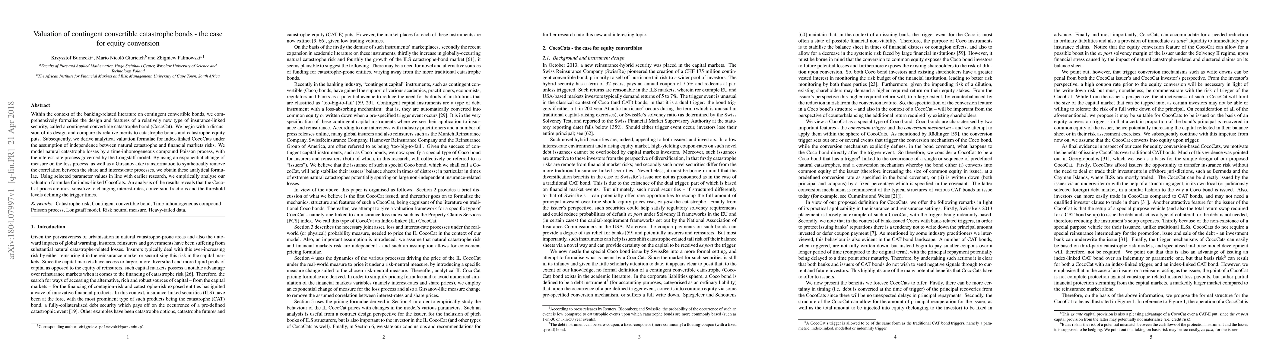 Within the context of the banking-related literature on contingent convertible bonds, we comprehensively formalise the design and features of a relatively new type of insurance-linked security, called a contingent convertible catastrophe bond (CocoCat). We begin with a discussion of its design and compare its relative merits to catastrophe bonds and catastrophe-equity puts. Subsequently, we derive analytical valuation formulae for index-linked CocoCats under the assumption of independence between natural catastrophe and financial markets risks. We model natural catastrophe losses by a time-inhomogeneous compound Poisson process, with the interest-rate process governed by the Longstaff model. By using an exponential change of measure on the loss process, as well as a Girsanov-like transformation to synthetically remove the correlation between the share and interest-rate processes, we obtain these analytical formulae. Using selected parameter values in line with earlier research, we empirically analyse our valuation formulae for index-linked CocoCats. An analysis of the results reveals that the CocoCat prices are most sensitive to changing interest-rates, conversion fractions and the threshold levels defining the trigger times.