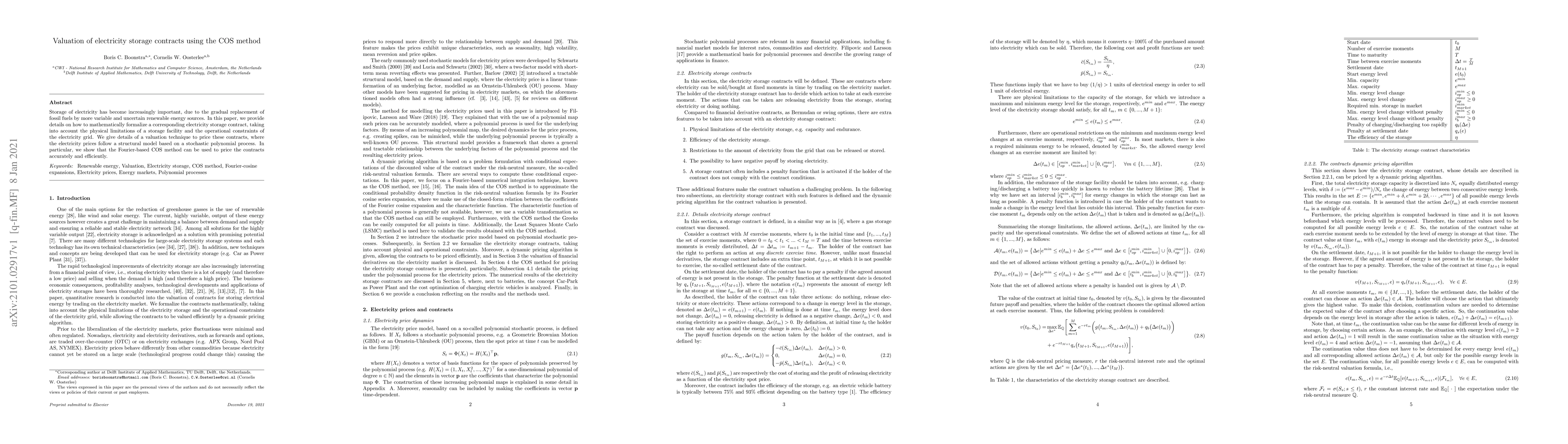 This paper details a mathematical framework for valuing electricity storage contracts, considering storage facility limitations and grid constraints. It employs the COS method, a Fourier-based technique, to efficiently and accurately price these contracts, which are crucial as renewable energy sources become more prevalent.