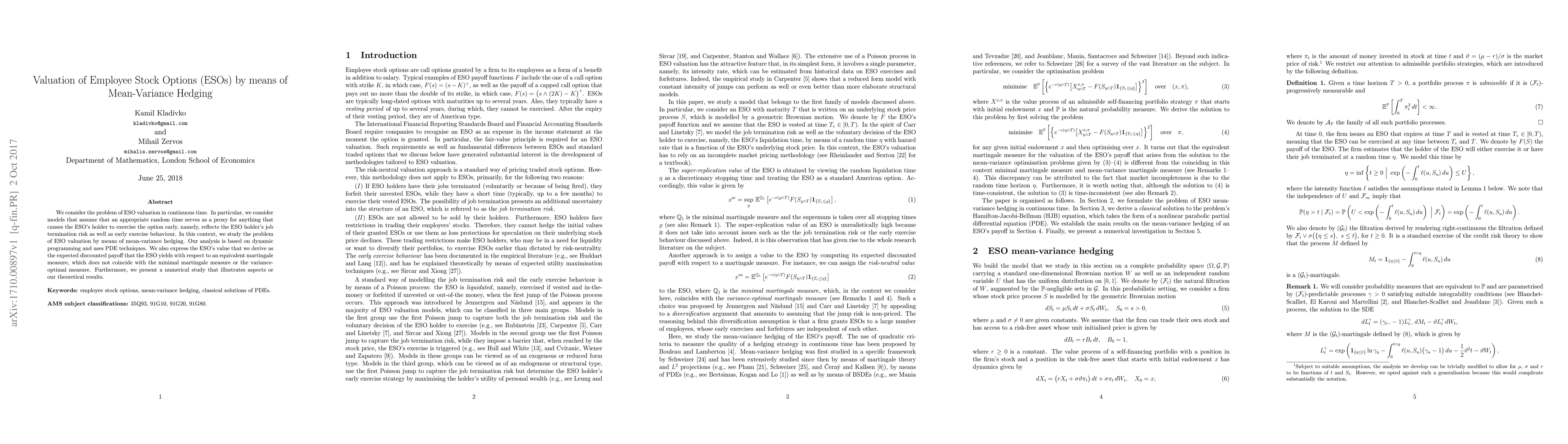 This paper explores the valuation of employee stock options (ESOs) using mean-variance hedging in continuous time, incorporating job termination risk. It employs dynamic programming and PDE techniques to derive the ESO's value as the expected discounted payoff under an equivalent martingale measure, and includes a numerical study to illustrate the theoretical results.