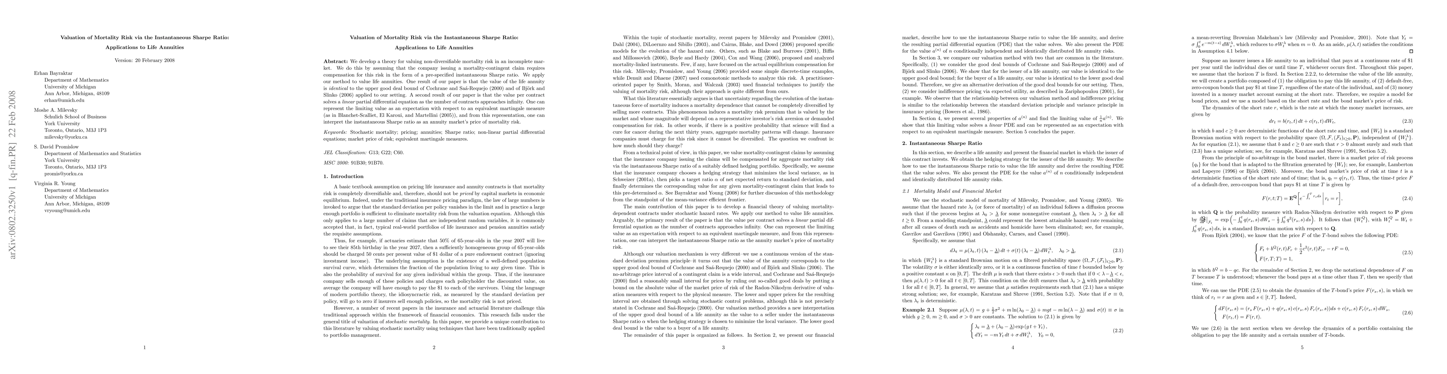 This paper develops a theory for valuing mortality risk in incomplete markets using the instantaneous Sharpe ratio, showing that life annuity values match existing upper bounds. It also demonstrates that the annuity value per contract solves a linear partial differential equation in large contract numbers, interpreting the Sharpe ratio as the market's mortality risk price.