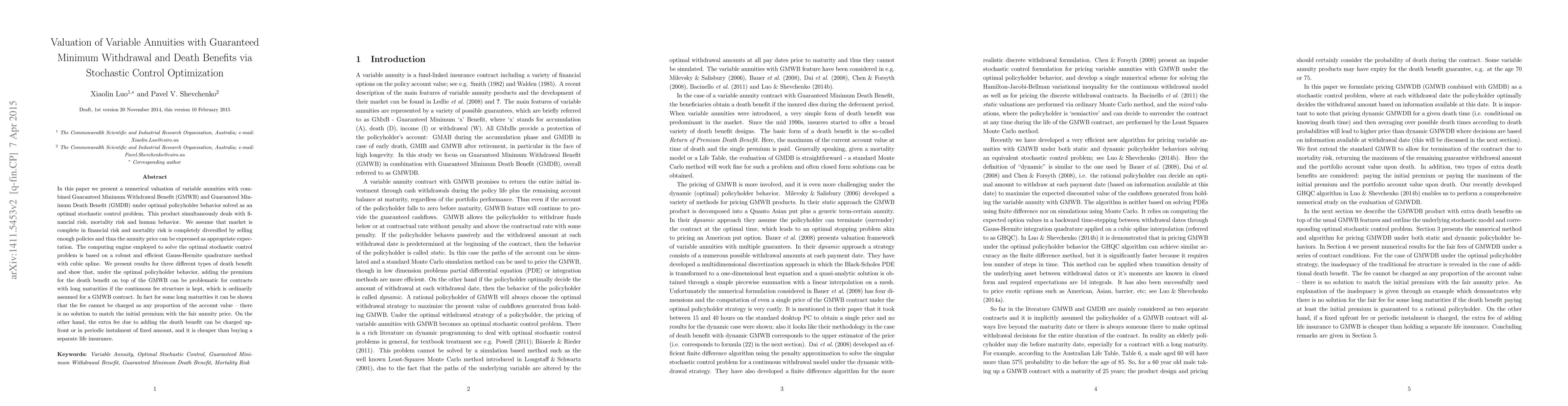 This paper numerically values variable annuities with Guaranteed Minimum Withdrawal Benefit (GMWB) and Guaranteed Minimum Death Benefit (GMDB) using stochastic control optimization. It finds that adding a premium for the death benefit can be problematic for long-term contracts if continuous fees are maintained, but upfront or periodic fixed fees are more cost-effective than separate life insurance.
