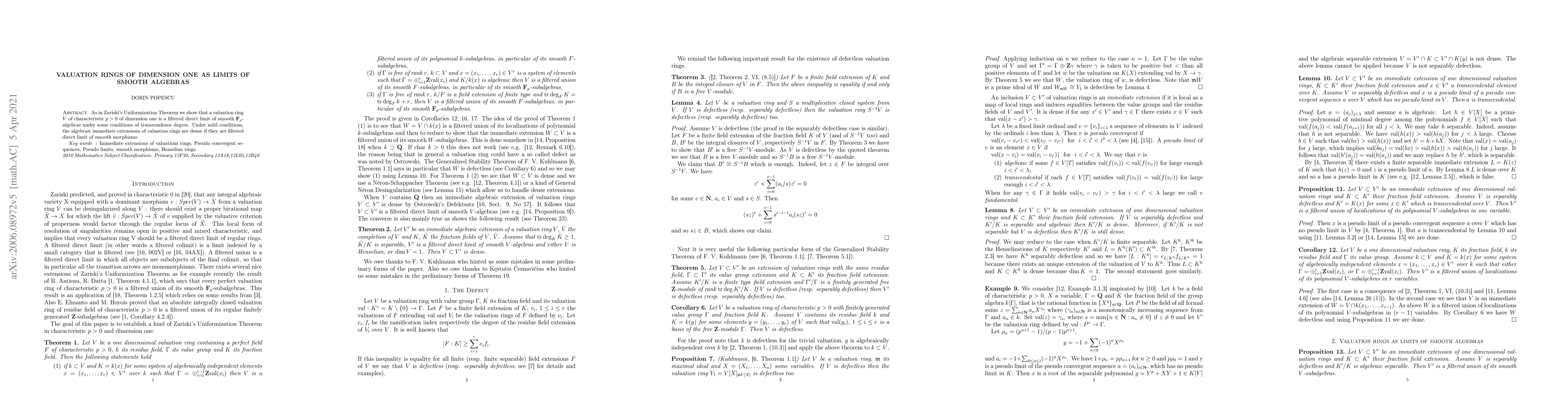 This paper demonstrates that valuation rings of dimension one in characteristic $p>0$ can be expressed as filtered direct limits of smooth ${\bf F}_p$-algebras, paralleling Zariski's Uniformization Theorem, and shows that under certain conditions, algebraic immediate extensions of these valuation rings are dense.