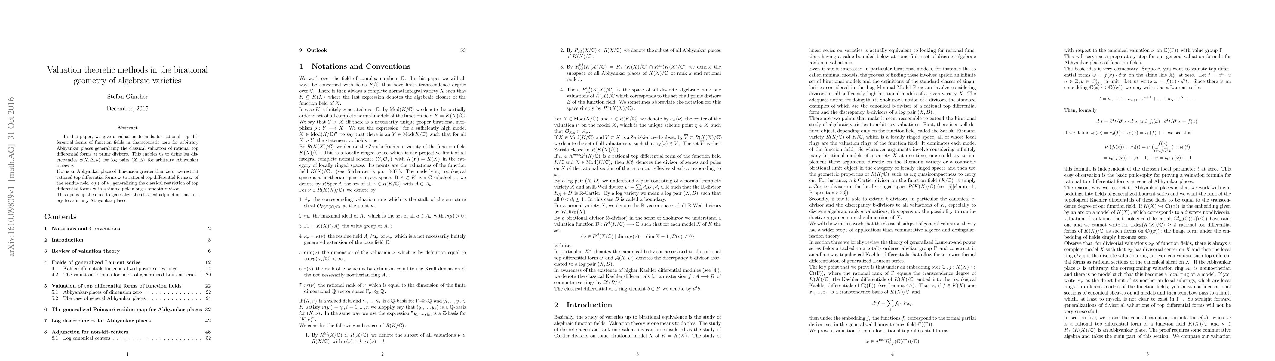 The paper develops valuation formulas for rational top differential forms in function fields, enabling log discrepancies to be defined for arbitrary Abhyankar places. This opens up the possibility of generalizing classical adjunction machinery to these cases.