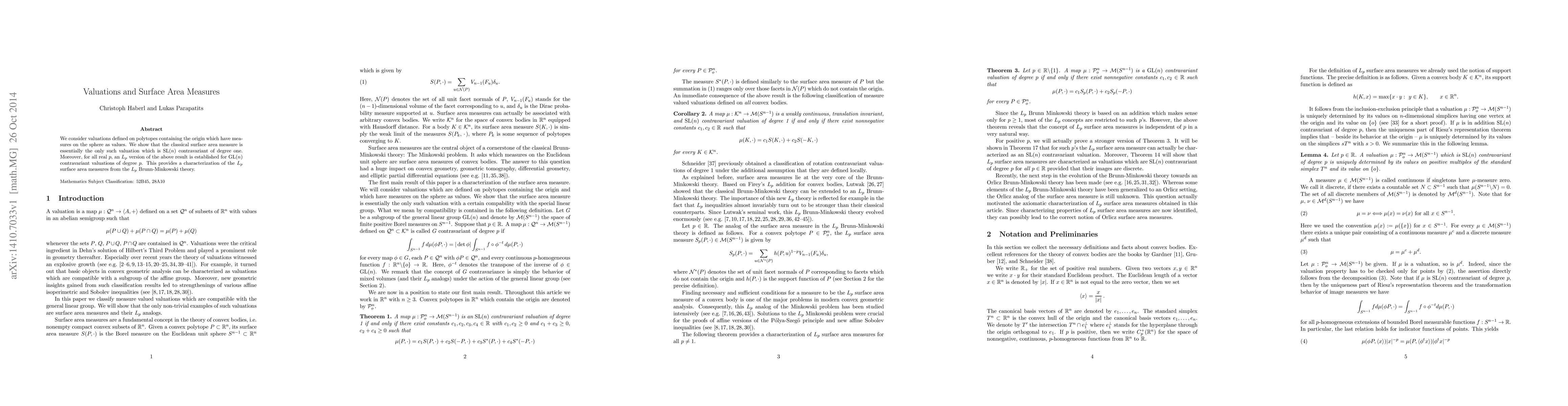 This paper characterizes the classical surface area measure as the unique SL(n) contravariant valuation of degree one on polytopes containing the origin. It also extends this result to GL(n) contravariant valuations of degree p for all real p, thereby identifying the $L_p$ surface area measures within the $L_p$ Brunn-Minkowski theory.