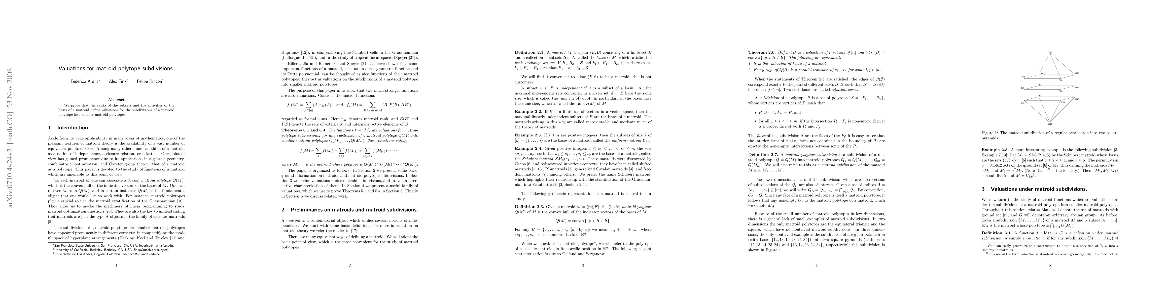 This paper demonstrates that the rank function of subsets and the activity of bases in a matroid provide valuations for subdivisions of a matroid polytope, offering a new perspective on the geometric structure of these subdivisions.