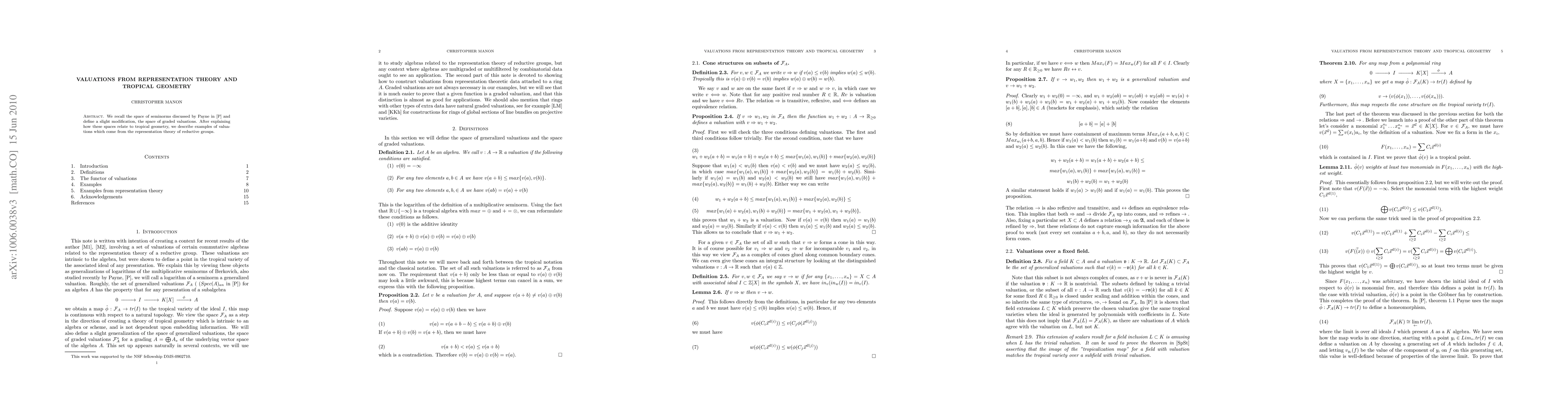 This paper explores the space of graded valuations, a modified version of Payne's seminorms, and connects it to tropical geometry. It also illustrates how these valuations arise from the representation theory of reductive groups.