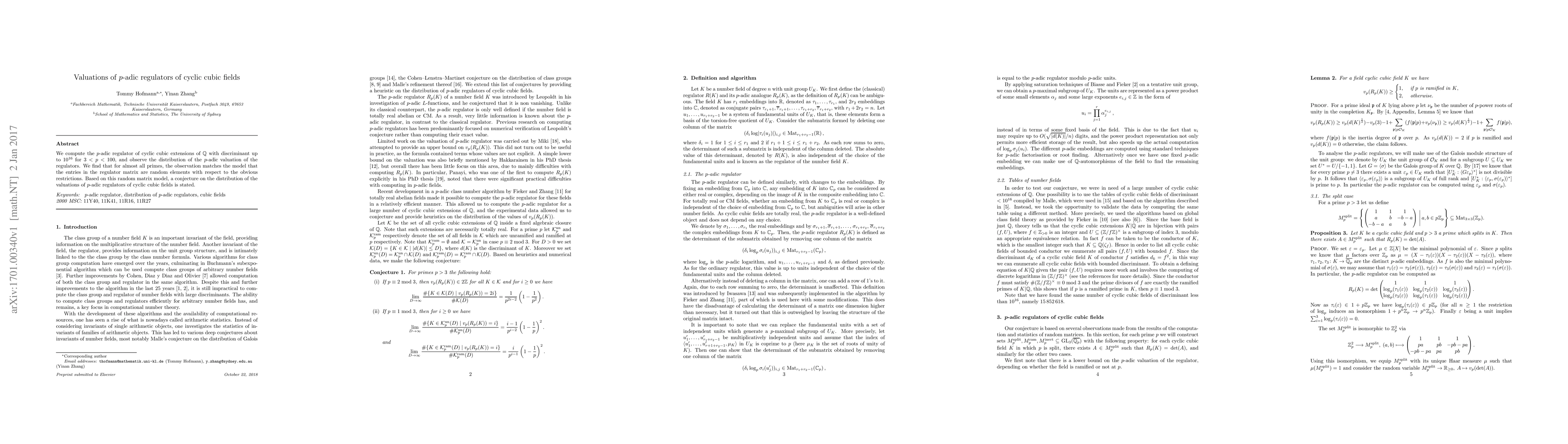 This paper computes $p$-adic regulators for cyclic cubic extensions of $\mathbb Q$ and analyzes their valuations for primes $3<p<100$. It finds that the observed distribution aligns with a random matrix model, leading to a conjecture on the valuation distribution.
