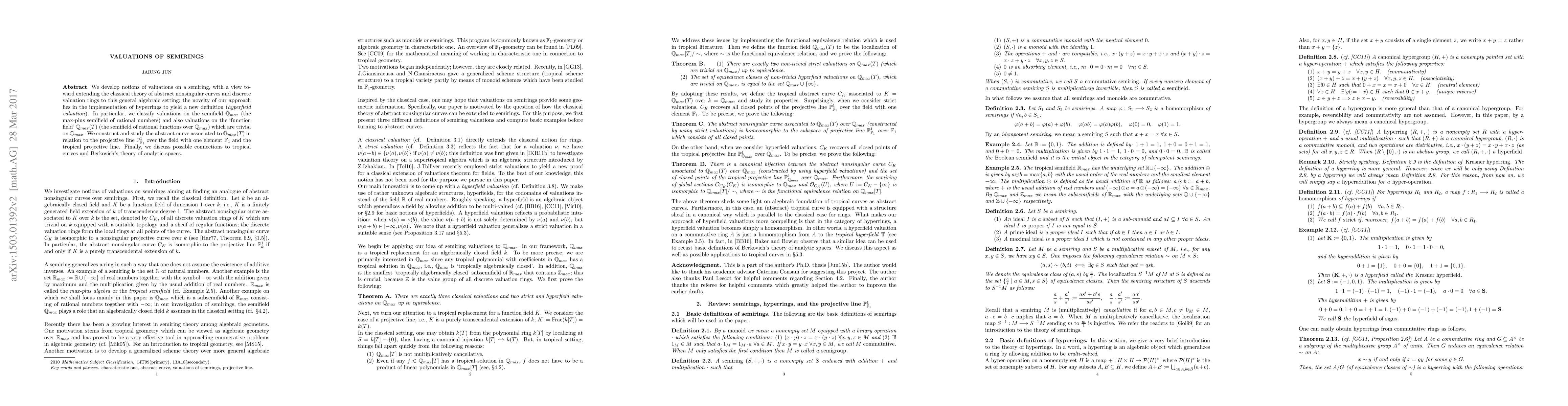 Researchers develop new notions of valuations on semirings, a general algebraic setting that extends classical theory to non-singular curves and discrete valuation rings. They classify valuations on specific semifields, including the max-plus semifield of rational numbers and the field of rational functions over it.