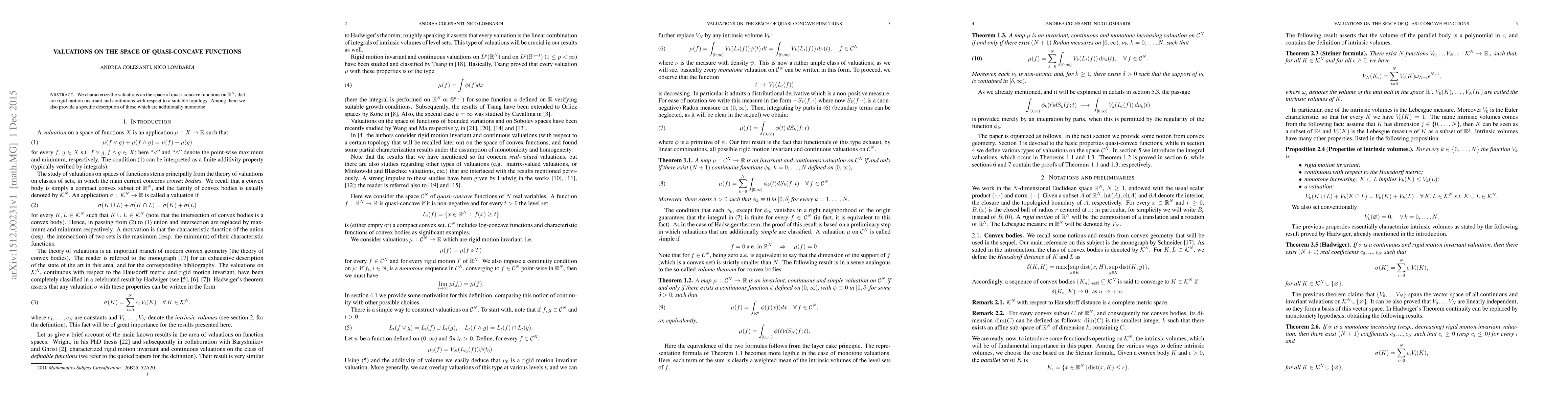 This paper characterizes valuations on the space of quasi-concave functions that are invariant under rigid motions and continuous. It also provides a detailed description of those valuations that are additionally monotone.