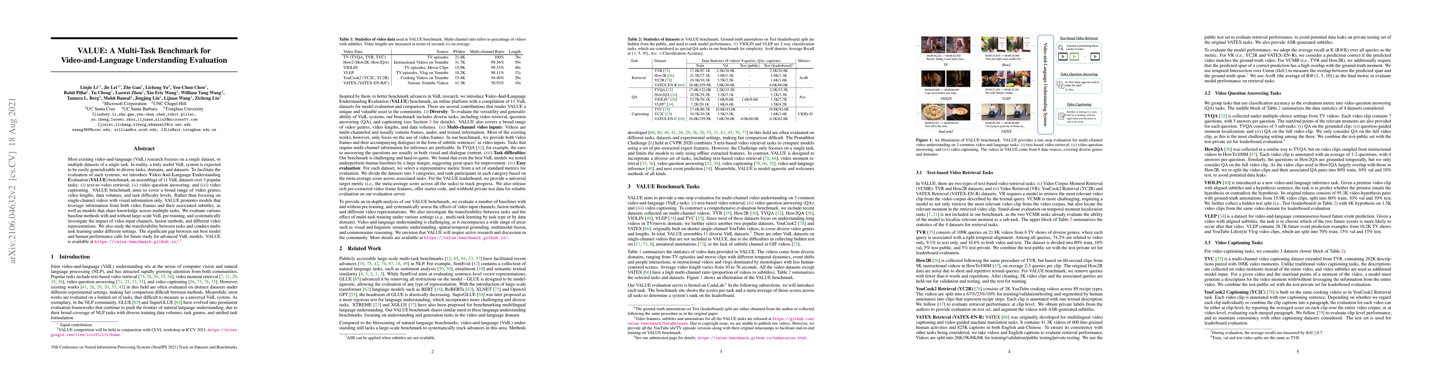 The VALUE benchmark introduces a multi-task evaluation framework for video-and-language understanding, comprising 11 datasets across text-to-video retrieval, video question answering, and video captioning to assess model generalizability. The benchmark investigates the effectiveness of multi-task learning and the integration of visual and subtitle data, highlighting the need for further advancements in video-and-language models.