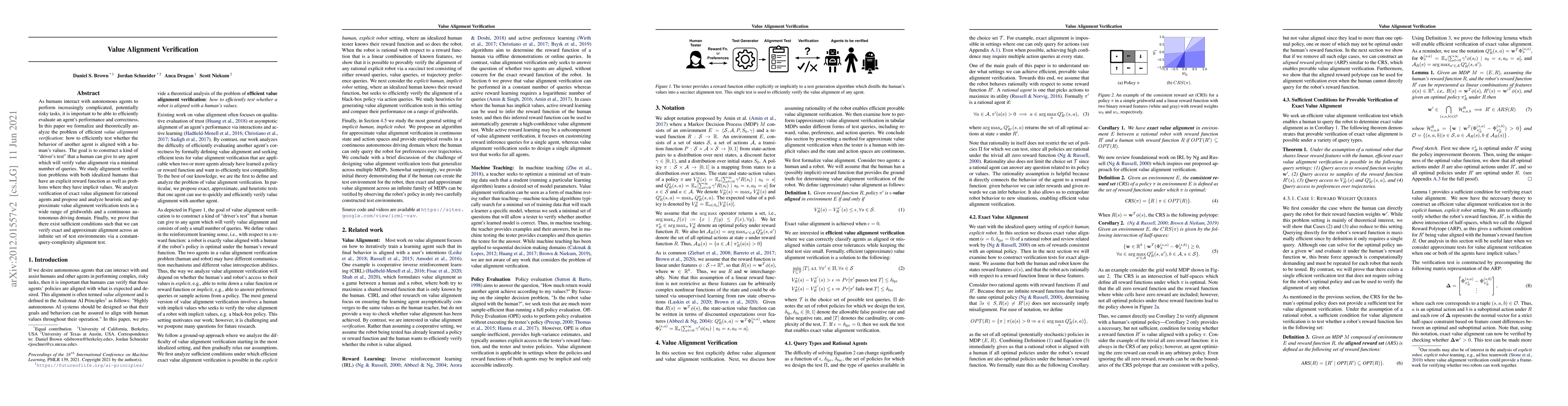 This paper formalizes the problem of efficiently verifying value alignment between autonomous agents and human values, proposing heuristic and approximate tests to achieve this with minimal queries. It analyzes both explicit and implicit human value scenarios, proving conditions for constant-query-complexity alignment verification across diverse environments.