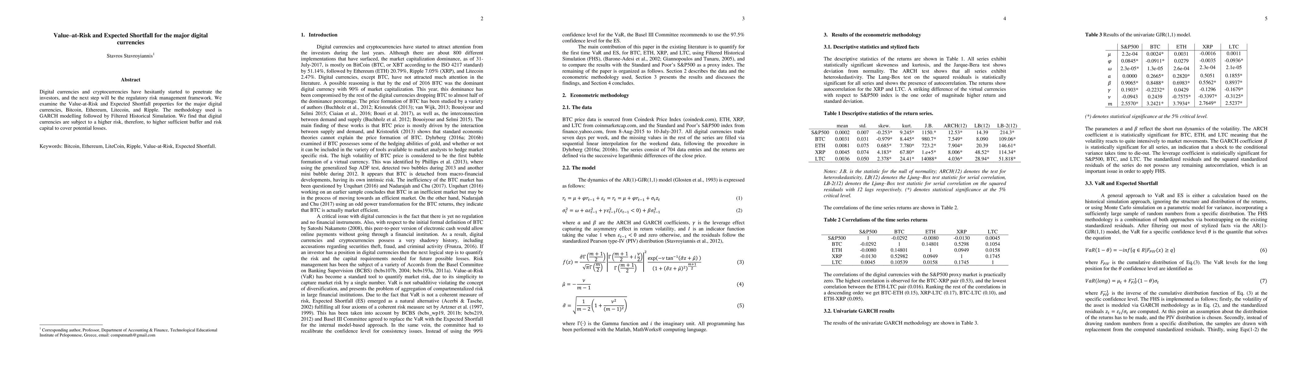 Digital currencies and cryptocurrencies have hesitantly started to penetrate the investors, and the next step will be the regulatory risk management framework. We examine the Value-at-Risk and Expected Shortfall properties for the major digital currencies, Bitcoin, Ethereum, Litecoin, and Ripple. The methodology used is GARCH modelling followed by Filtered Historical Simulation. We find that digital currencies are subject to a higher risk, therefore, to higher sufficient buffer and risk capital to cover potential losses.