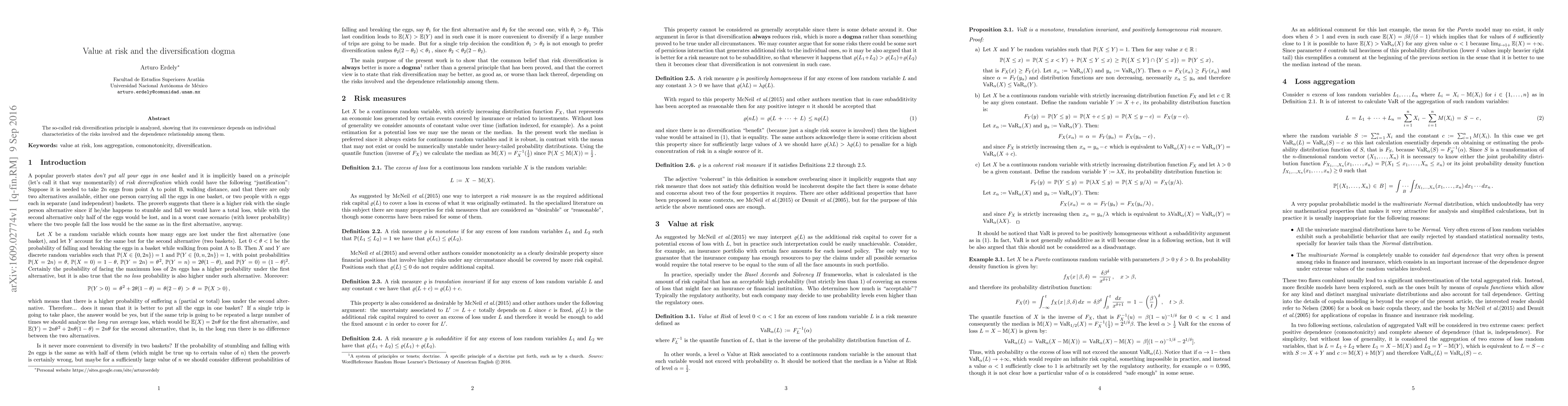 The so-called risk diversification principle is analyzed, showing that its convenience depends on individual characteristics of the risks involved and the dependence relationship among them. ----- Se analiza el principio de diversificaci\'on de riesgos y se demuestra que no siempre resulta mejor que no diversificar, pues esto depende de caracter\'isticas individuales de los riesgos involucrados, as\'i como de la relaci\'on de dependencia entre los mismos.