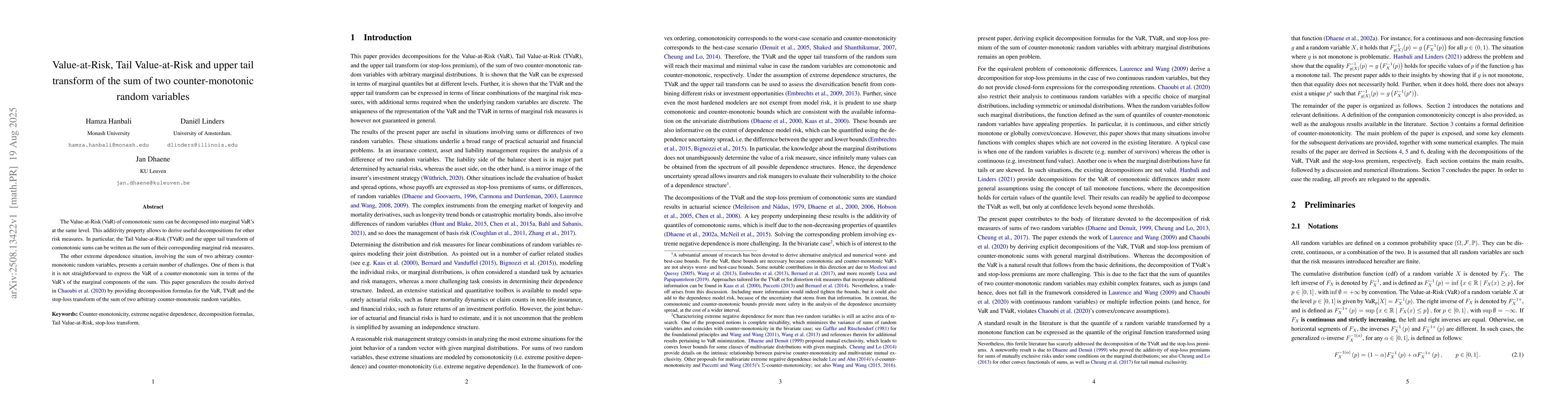 The Value-at-Risk (VaR) of comonotonic sums can be decomposed into marginal VaR's at the same level. This additivity property allows to derive useful decompositions for other risk measures. In particular, the Tail Value-at-Risk (TVaR) and the upper tail transform of comonotonic sums can be written as the sum of their corresponding marginal risk measures. The other extreme dependence situation, involving the sum of two arbitrary counter-monotonic random variables, presents a certain number of challenges. One of them is that it is not straightforward to express the VaR of a counter-monotonic sum in terms of the VaR's of the marginal components of the sum. This paper generalizes the results derived in Chaoubi et al. (2020) by providing decomposition formulas for the VaR, TVaR and the stop-loss transform of the sum of two arbitrary counter-monotonic random variables.