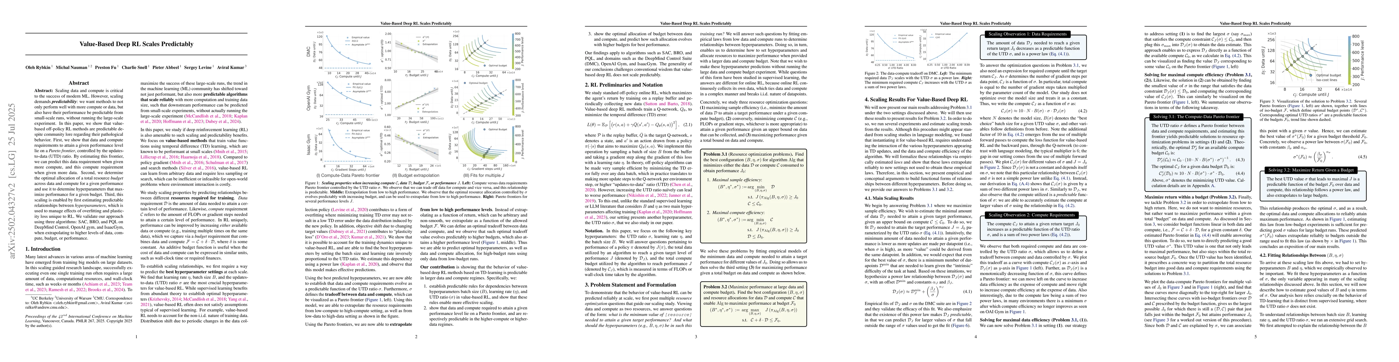 Scaling data and compute is critical to the success of modern ML. However, scaling demands predictability: we want methods to not only perform well with more compute or data, but also have their performance be predictable from small-scale runs, without running the large-scale experiment. In this paper, we show that value-based off-policy RL methods are predictable despite community lore regarding their pathological behavior. First, we show that data and compute requirements to attain a given performance level lie on a Pareto frontier, controlled by the updates-to-data (UTD) ratio. By estimating this frontier, we can predict this data requirement when given more compute, and this compute requirement when given more data. Second, we determine the optimal allocation of a total resource budget across data and compute for a given performance and use it to determine hyperparameters that maximize performance for a given budget. Third, this scaling is enabled by first estimating predictable relationships between hyperparameters, which is used to manage effects of overfitting and plasticity loss unique to RL. We validate our approach using three algorithms: SAC, BRO, and PQL on DeepMind Control, OpenAI gym, and IsaacGym, when extrapolating to higher levels of data, compute, budget, or performance.