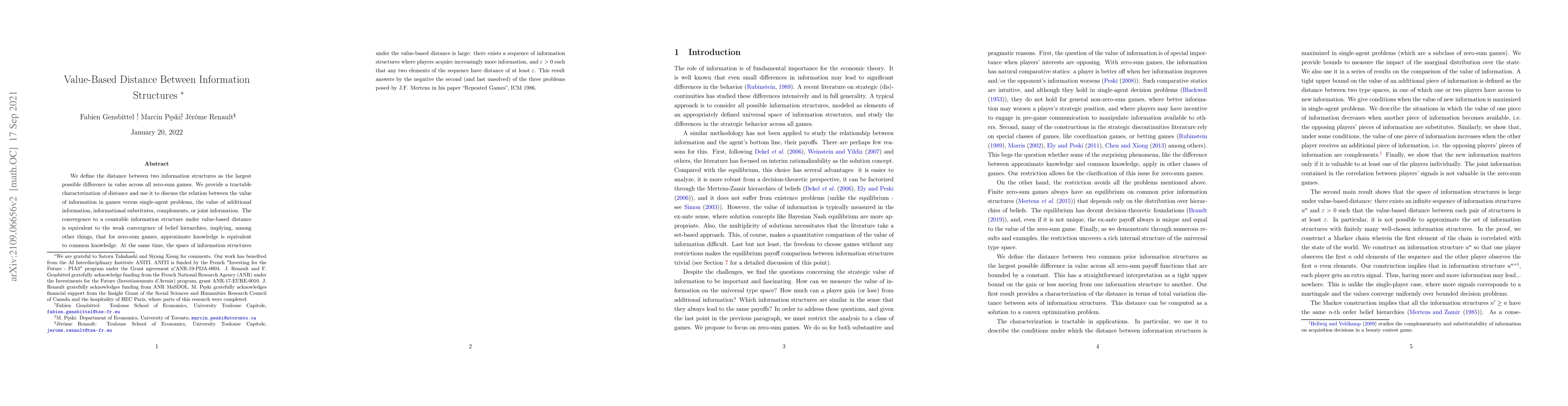 We define the distance between two information structures as the largest possible difference in value across all zero-sum games. We provide a tractable characterization of distance and use it to discuss the relation between the value of information in games versus single-agent problems, the value of additional information, informational substitutes, complements, or joint information. The convergence to a countable information structure under value-based distance is equivalent to the weak convergence of belief hierarchies, implying, among other things, that for zero-sum games, approximate knowledge is equivalent to common knowledge. At the same time, the space of information structures under the value-based distance is large: there exists a sequence of information structures where players acquire increasingly more information, and $\epsilon$ > 0 such that any two elements of the sequence have distance of at least $\epsilon$. This result answers by the negative the second (and last unsolved) of the three problems posed by J.F. Mertens in his paper Repeated Games , ICM 1986.