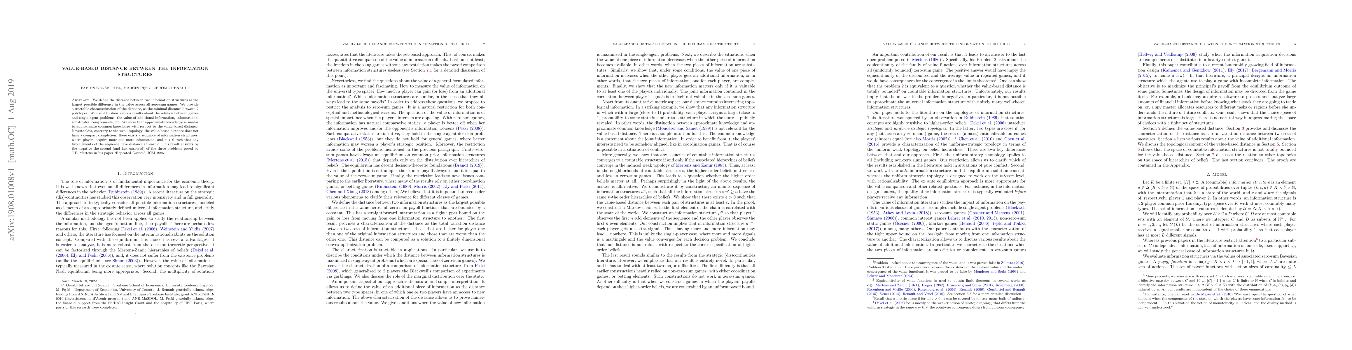 We dene the distance between two information structures as the largest possible dierence in the value across all zero-sum games. We provide a tractable characterization of the distance, as the minimal distance between 2 polytopes. We use it to show various results about the relation between games and single-agent problems, the value of additional information, informational substitutes, complements, etc. We show that approximate knowledge is similar to approximate common knowledge with respect to the value-based distance. Nevertheless, contrary to the weak topology, the value-based distance does not have a compact completion: there exists a sequence of information structures, where players acquire more and more information, and $\epsilon$ > 0 such that any two elements of the sequence have distance at least $\epsilon$. This result answers by the negative the second (and last unsolved) of the three problems posed by J.F. Mertens in his paper Repeated Games", ICM 1986.