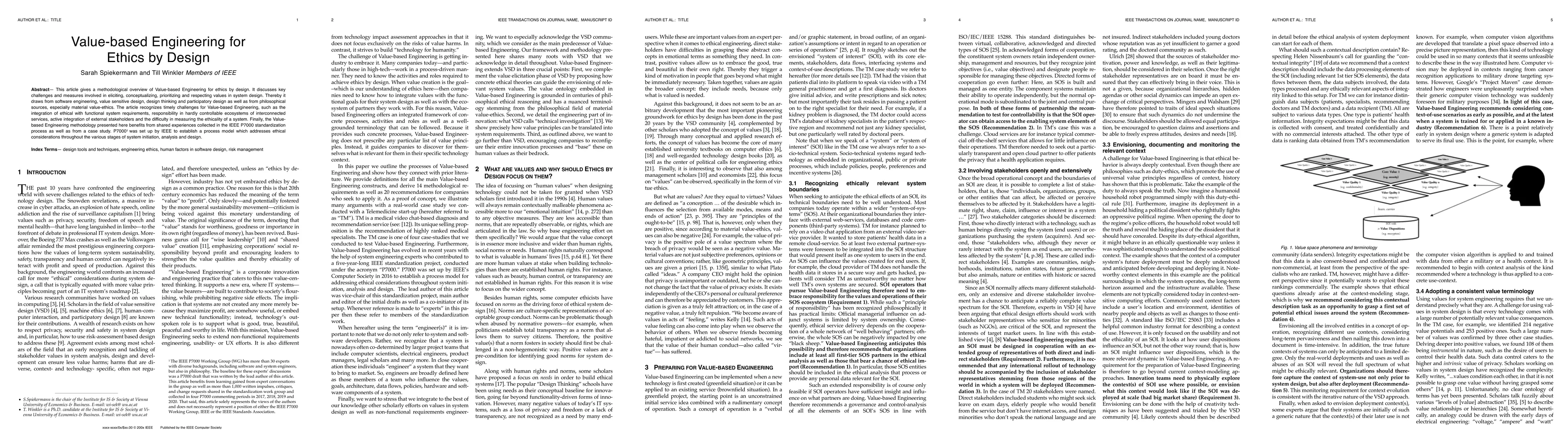 This research paper introduces a method for integrating ethics into system design through Value-based Engineering for Ethics by Design. It aims to address challenges in measuring the ethicality of systems and benefits from IEEE P7000 standardization process and a case study.