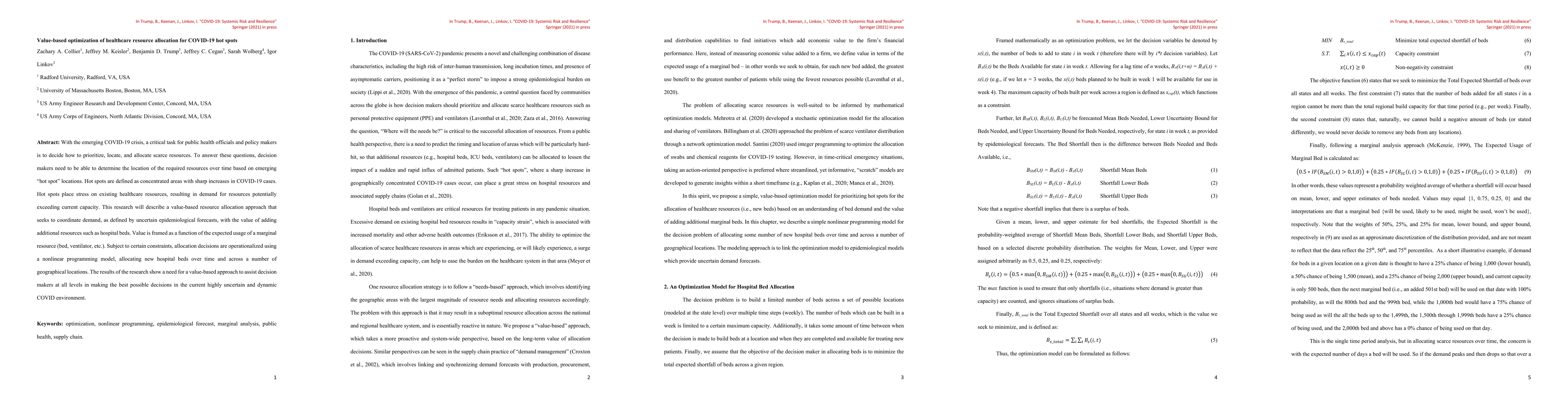 A value-based optimization approach helps allocate scarce healthcare resources to COVID-19 hot spots, prioritizing areas with high demand for hospital beds and ventilators. This method coordinates resource allocation with epidemiological forecasts to make informed decisions in a dynamic and uncertain environment.