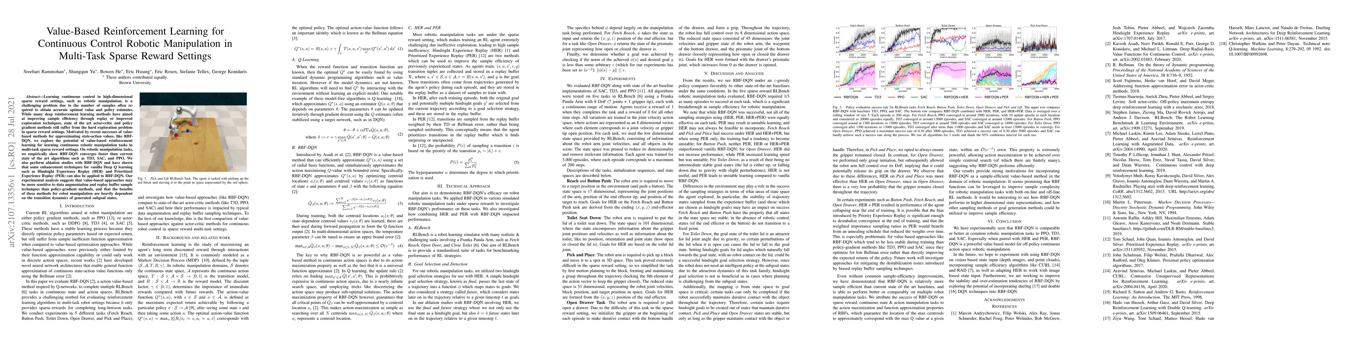 This paper investigates value-based reinforcement learning methods, specifically RBF-DQN, for continuous control in robotic manipulation tasks with sparse rewards. RBF-DQN is shown to converge faster than state-of-the-art actor-critic methods, highlighting the potential of value-based approaches in multi-task settings.