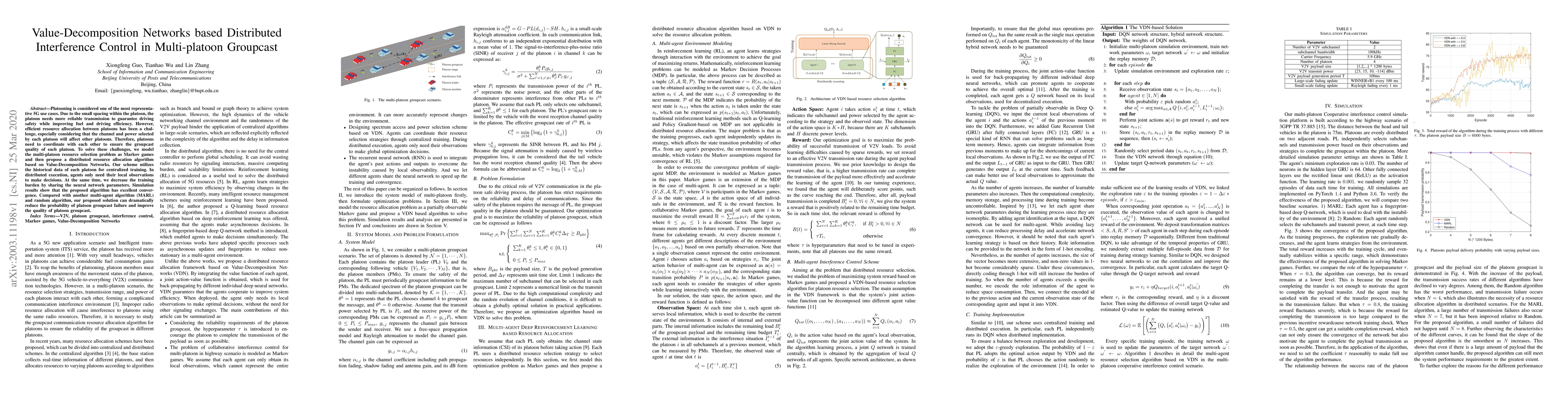 This paper proposes a distributed interference control algorithm for multi-platoon groupcast using Value-Decomposition Networks, addressing the challenge of efficient resource allocation among platoons to ensure reliable communication and safety. The method shows significant improvement in reducing groupcast failure rates and enhancing communication quality compared to other algorithms.