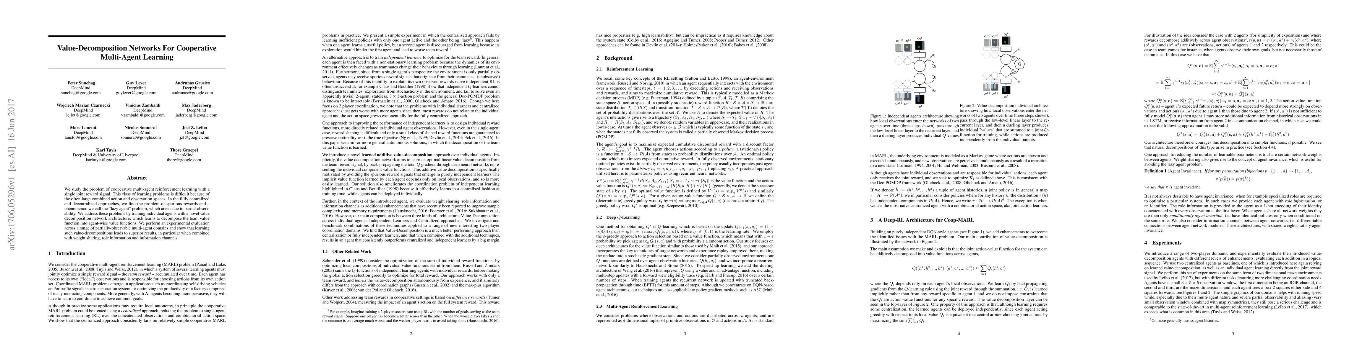 This paper proposes value-decomposition networks to tackle cooperative multi-agent reinforcement learning challenges, particularly addressing spurious rewards and the "lazy agent" problem in partially observable environments. Experimental results demonstrate improved performance through decomposed value functions, especially when combined with weight sharing, role information, and communication channels.