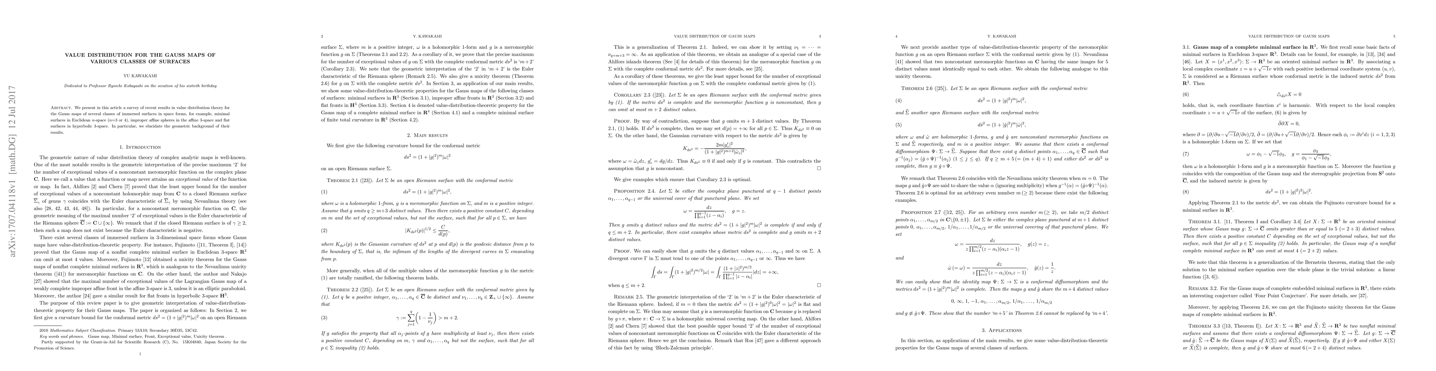 This paper surveys recent findings in value distribution theory for Gauss maps of various classes of immersed surfaces, including minimal surfaces in Euclidean spaces, improper affine spheres, and flat surfaces in hyperbolic space, highlighting their geometric implications.