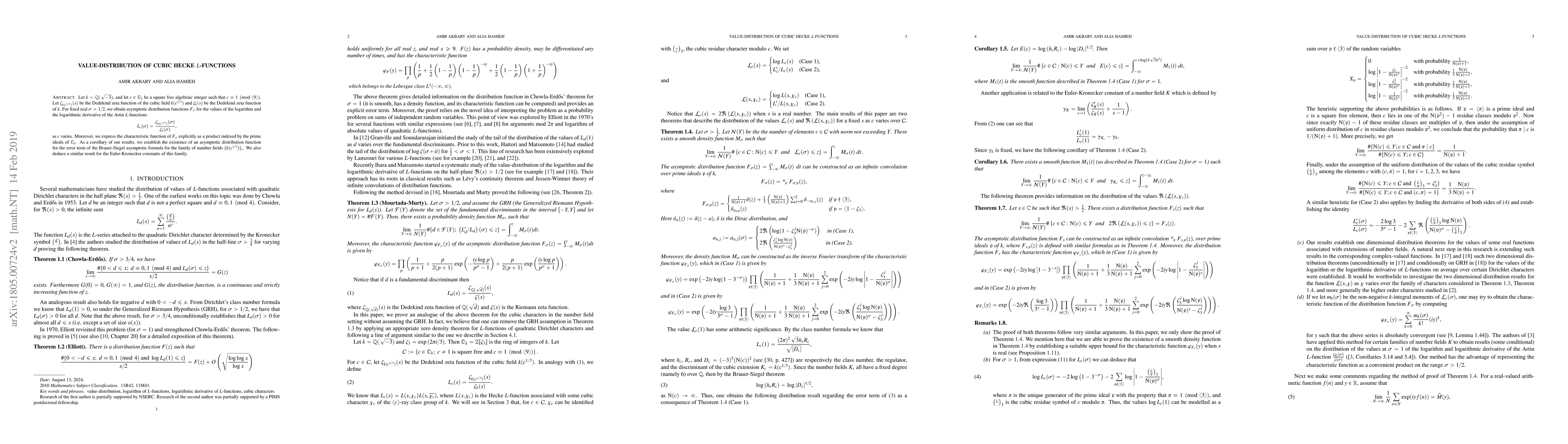 This paper studies the asymptotic distribution of values for cubic Hecke $L$-functions associated with the cubic field $k(\sqrt{-3})$ and specific algebraic integers $c$. It derives explicit forms for the distribution functions and establishes the existence of an asymptotic distribution for the error term of the Brauer-Siegel formula for this family of number fields.