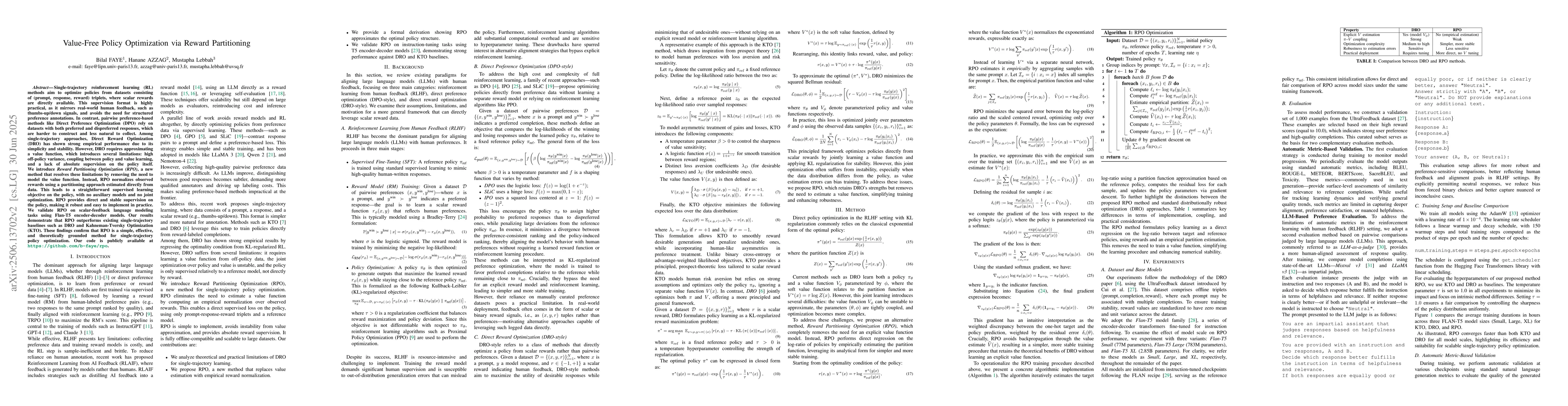 Single-trajectory reinforcement learning (RL) methods aim to optimize policies from datasets consisting of (prompt, response, reward) triplets, where scalar rewards are directly available. This supervision format is highly practical, as it mirrors real-world human feedback, such as thumbs-up/down signals, and avoids the need for structured preference annotations. In contrast, pairwise preference-based methods like Direct Preference Optimization (DPO) rely on datasets with both preferred and dispreferred responses, which are harder to construct and less natural to collect. Among single-trajectory approaches, Direct Reward Optimization (DRO) has shown strong empirical performance due to its simplicity and stability. However, DRO requires approximating a value function, which introduces several limitations: high off-policy variance, coupling between policy and value learning, and a lack of absolute supervision on the policy itself. We introduce Reward Partitioning Optimization (RPO), a new method that resolves these limitations by removing the need to model the value function. Instead, RPO normalizes observed rewards using a partitioning approach estimated directly from data. This leads to a straightforward supervised learning objective on the policy, with no auxiliary models and no joint optimization. RPO provides direct and stable supervision on the policy, making it robust and easy to implement in practice. We validate RPO on scalar-feedback language modeling tasks using Flan-T5 encoder-decoder models. Our results demonstrate that RPO outperforms existing single-trajectory baselines such as DRO and Kahneman-Tversky Optimization (KTO). These findings confirm that RPO is a simple, effective, and theoretically grounded method for single-trajectory policy optimization.