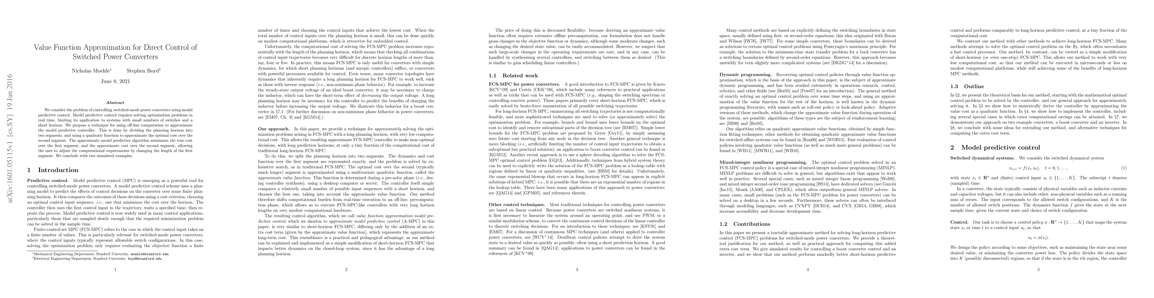 We consider the problem of controlling switched-mode power converters using model predictive control. Model predictive control requires solving optimization problems in real time, limiting its application to systems with small numbers of switches and a short horizon. We propose a technique for using off-line computation to approximate the model predictive controller. This is done by dividing the planning horizon into two segments, and using a quadratic function to approximate the optimal cost over the second segment. The approximate model predictive algorithm minimizes the true cost over the first segment, and the approximate cost over the second segment, allowing the user to adjust the computational requirements by changing the length of the first segment. We conclude with two simulated examples.