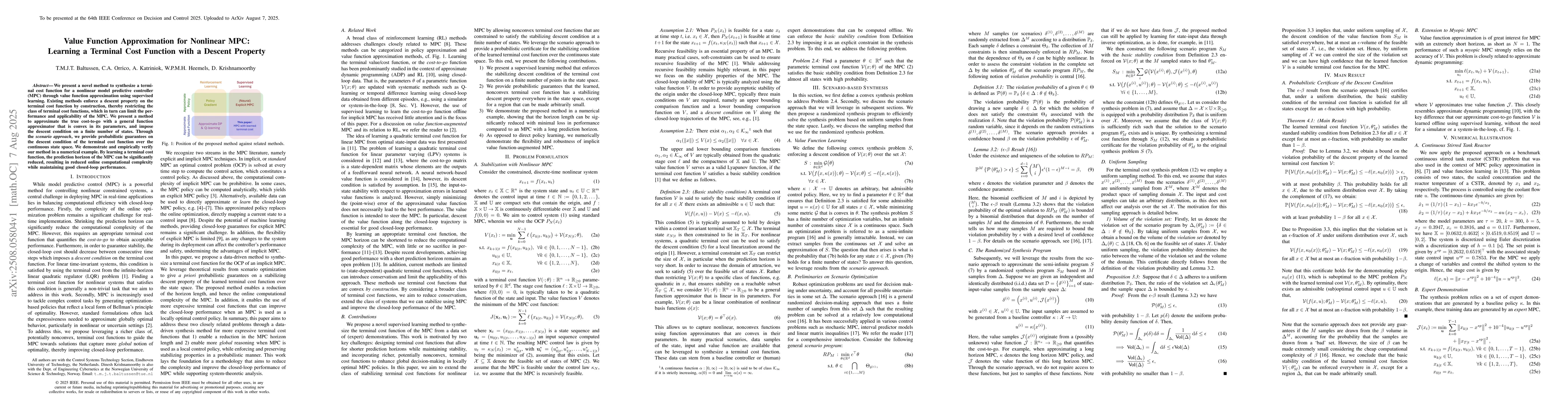 We present a novel method to synthesize a terminal cost function for a nonlinear model predictive controller (MPC) through value function approximation using supervised learning. Existing methods enforce a descent property on the terminal cost function by construction, thereby restricting the class of terminal cost functions, which in turn can limit the performance and applicability of the MPC. We present a method to approximate the true cost-to-go with a general function approximator that is convex in its parameters, and impose the descent condition on a finite number of states. Through the scenario approach, we provide probabilistic guarantees on the descent condition of the terminal cost function over the continuous state space. We demonstrate and empirically verify our method in a numerical example. By learning a terminal cost function, the prediction horizon of the MPC can be significantly reduced, resulting in reduced online computational complexity while maintaining good closed-loop performance.