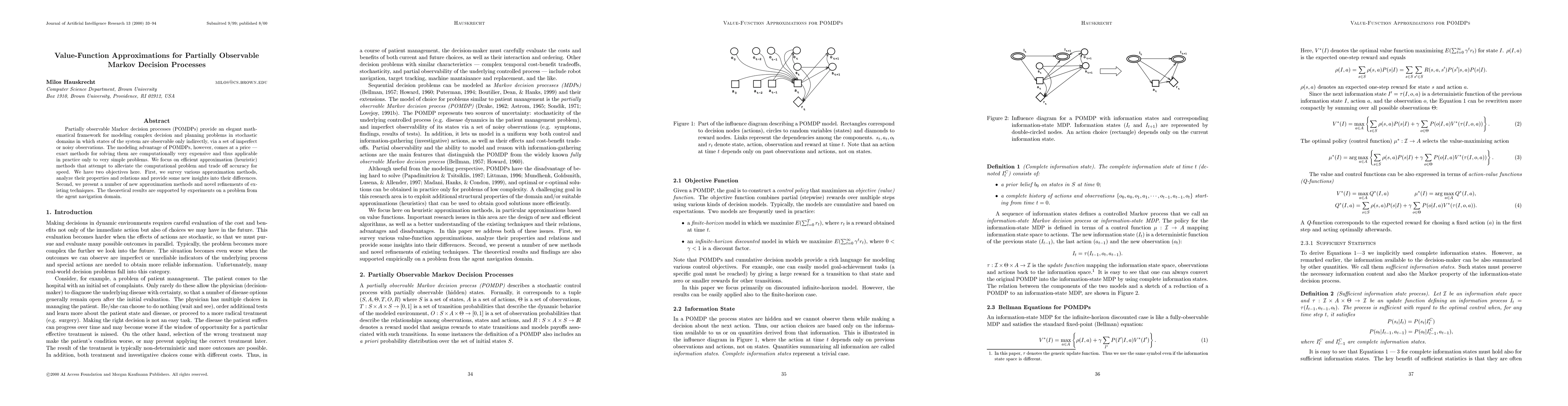 This paper surveys and analyzes various heuristic methods for solving partially observable Markov decision processes (POMDPs), focusing on efficient approximations that balance computational cost and accuracy. It also introduces new approximation techniques and refinements, supported by experiments in agent navigation.