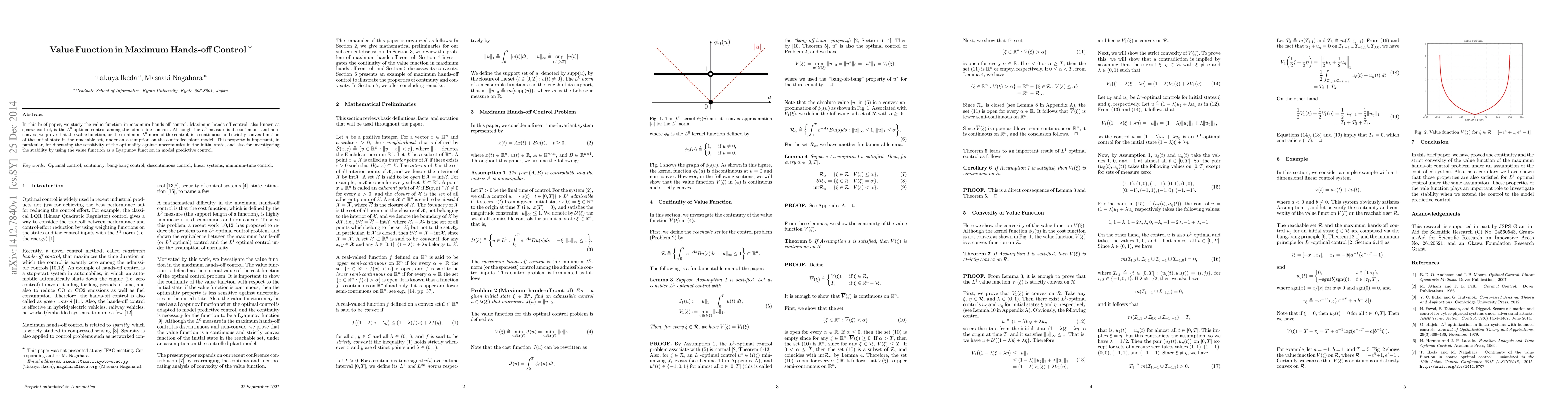 In this brief paper, we study the value function in maximum hands-off control. Maximum hands-off control, also known as sparse control, is the L0-optimal control among the admissible controls. Although the L0 measure is discontinuous and non- convex, we prove that the value function, or the minimum L0 norm of the control, is a continuous and strictly convex function of the initial state in the reachable set, under an assumption on the controlled plant model. This property is important, in particular, for discussing the sensitivity of the optimality against uncertainties in the initial state, and also for investigating the stability by using the value function as a Lyapunov function in model predictive control.