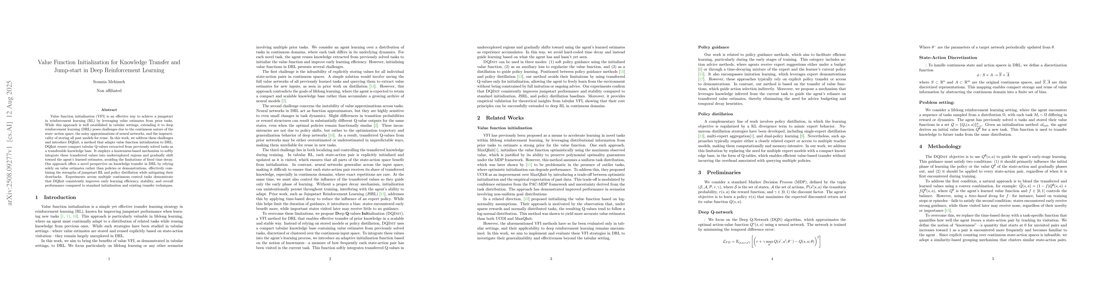 Value function initialization (VFI) is an effective way to achieve a jumpstart in reinforcement learning (RL) by leveraging value estimates from prior tasks. While this approach is well established in tabular settings, extending it to deep reinforcement learning (DRL) poses challenges due to the continuous nature of the state-action space, the noisy approximations of neural networks, and the impracticality of storing all past models for reuse. In this work, we address these challenges and introduce DQInit, a method that adapts value function initialization to DRL. DQInit reuses compact tabular Q-values extracted from previously solved tasks as a transferable knowledge base. It employs a knownness-based mechanism to softly integrate these transferred values into underexplored regions and gradually shift toward the agent's learned estimates, avoiding the limitations of fixed time decay. Our approach offers a novel perspective on knowledge transfer in DRL by relying solely on value estimates rather than policies or demonstrations, effectively combining the strengths of jumpstart RL and policy distillation while mitigating their drawbacks. Experiments across multiple continuous control tasks demonstrate that DQInit consistently improves early learning efficiency, stability, and overall performance compared to standard initialization and existing transfer techniques.
