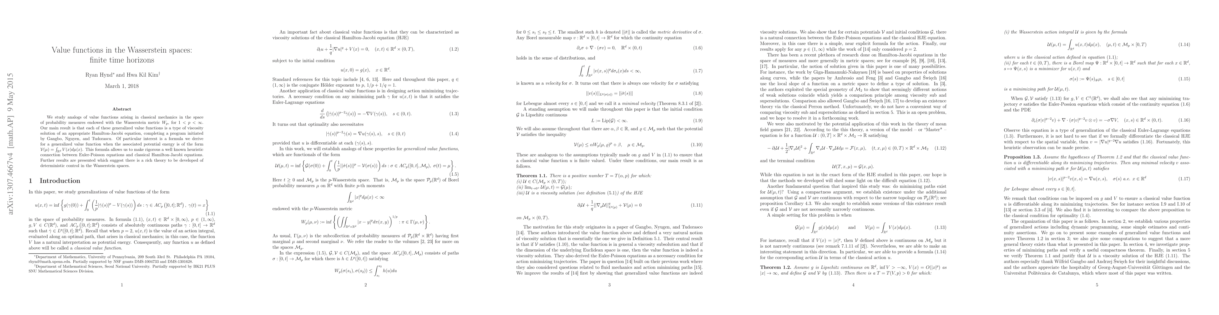We study analogs of value functions arising in classical mechanics in the space of probability measures endowed with the Wasserstein metric $W_p$, for $1