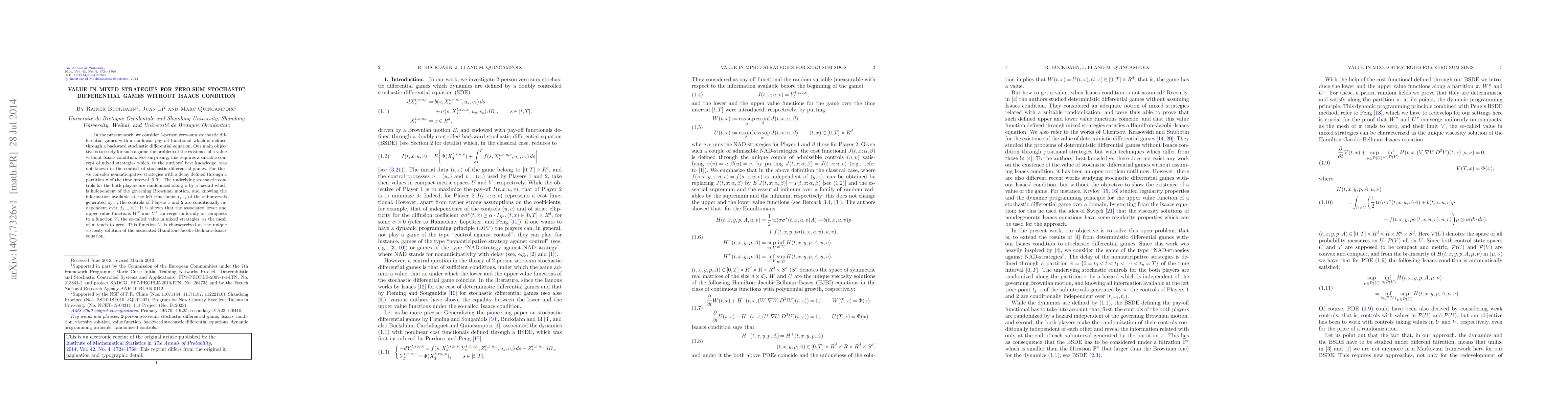 This paper investigates 2-person zero-sum stochastic differential games without the Isaacs condition, focusing on the existence of a value in mixed strategies. It introduces a novel concept of nonanticipative strategies with delays, showing that the associated lower and upper value functions converge to a unique viscosity solution of the Hamilton-Jacobi-Bellman-Isaacs equation, termed the value in mixed strategies.