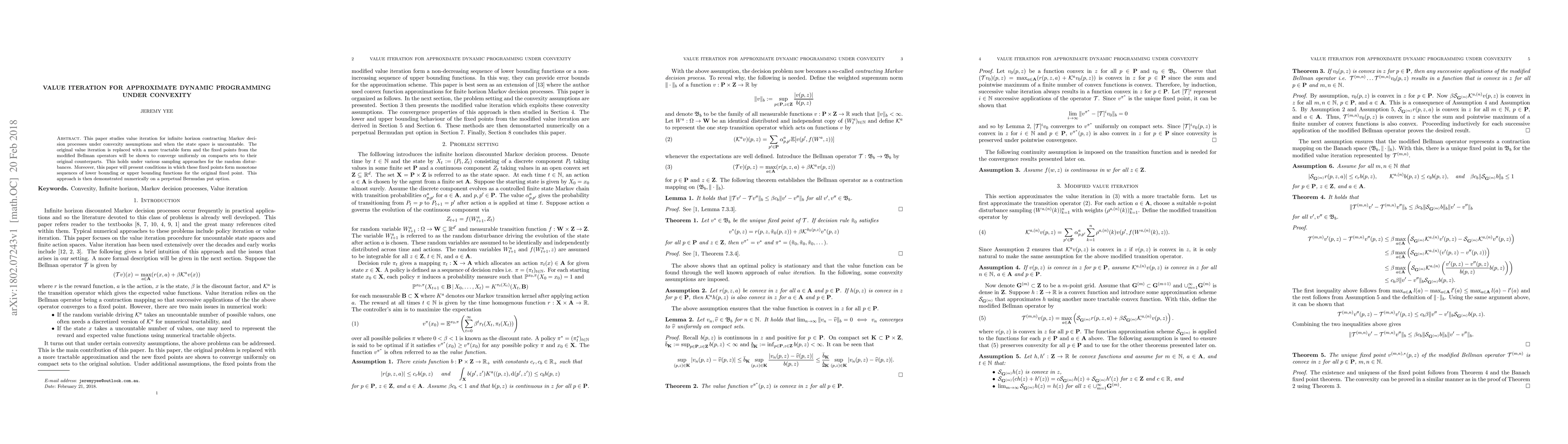 This paper proposes a modified value iteration method for infinite horizon Markov decision processes under convexity, showing uniform convergence on compact sets and monotonicity of fixed points. It is numerically demonstrated using a perpetual Bermudan put option.