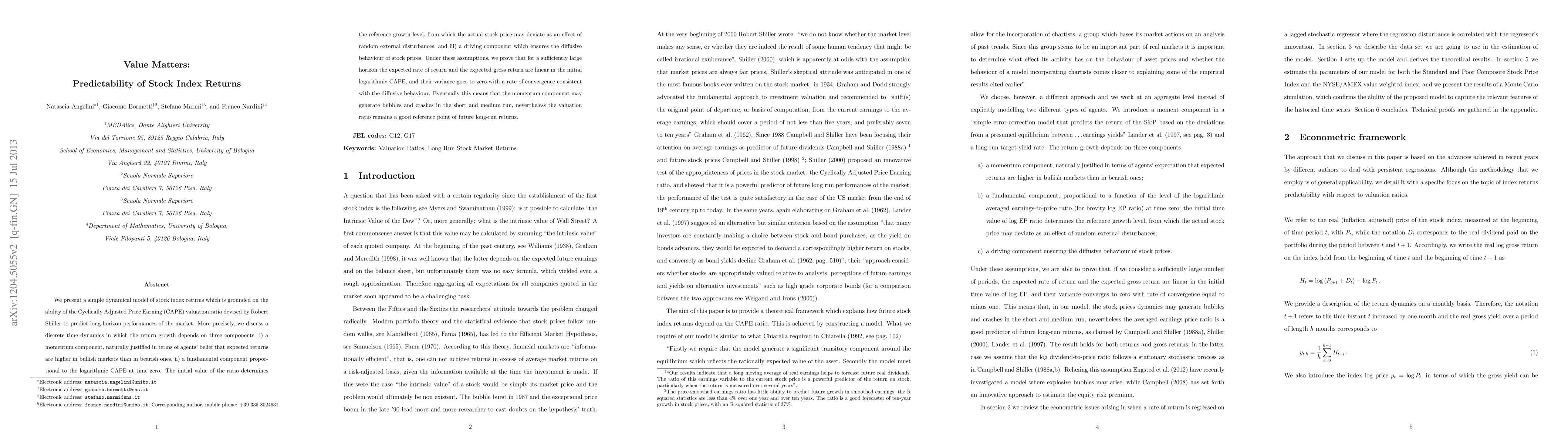 A model using CAPE valuation ratio predicts stock index returns with a momentum component driving short-term fluctuations, while the fundamental component influences long-run performance.